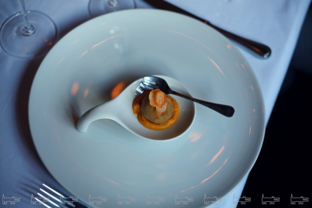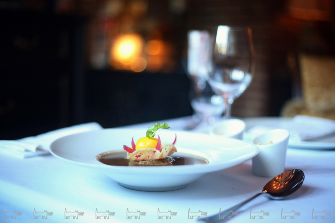 Классический эльзасский луковый суп в авторском исполнении – настоящее шоу. В тарелке на красном луковом confit восседает корзинка из сыра и яичный желток, приготовленный по всем традициям молекулярной кухни. Вся эта пирамида потребностей заливается бульоном в присутствии гостя, то есть меня. На фото видно, как внимательно я слежу за поэтапной подачей. К супу можно и нужно добавить тертый сыр Emmentaler и сухарики. Самое приятное – комплимент от шеф-повара. Им оказался утиный кьес конфи в виде шарика, украшенный муссом из моркови.