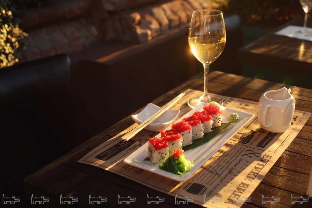 В «золотой час» пропустить бокальчик на летнике с видом на Пушкинскую – что может быть приятнее в последние дни Бабьего лета? Кавист Александр рассказывает мне все о том, что я собираюсь пить прямо сейчас. Виноград для моего напитка вечера был выращен в регионе Мюскаде Севр э Мен в Долине Луары, площадь виноградников хозяйства составляет 40 гектаров. И не только названием единым: ослепительный цвет, аромат с тонами яблока, груши и грейпфрута и чистый минеральный вкус – солнце в бокале, не иначе. Классические роллы «Калифорния» лежат на бамбуковом листе в ожидании фото для Instagram – щелк!