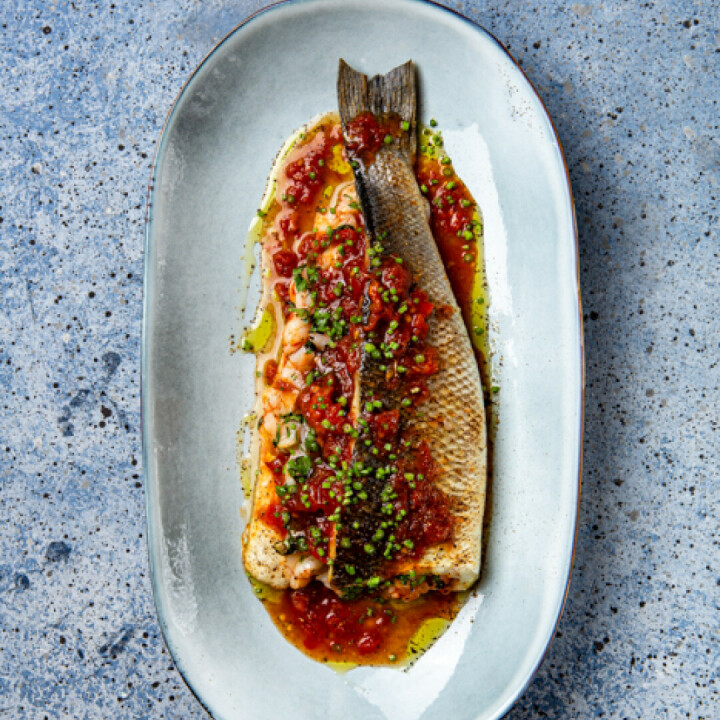 Сибас, фаршированный креветками с томатной сальсой, от Олега Перфилова