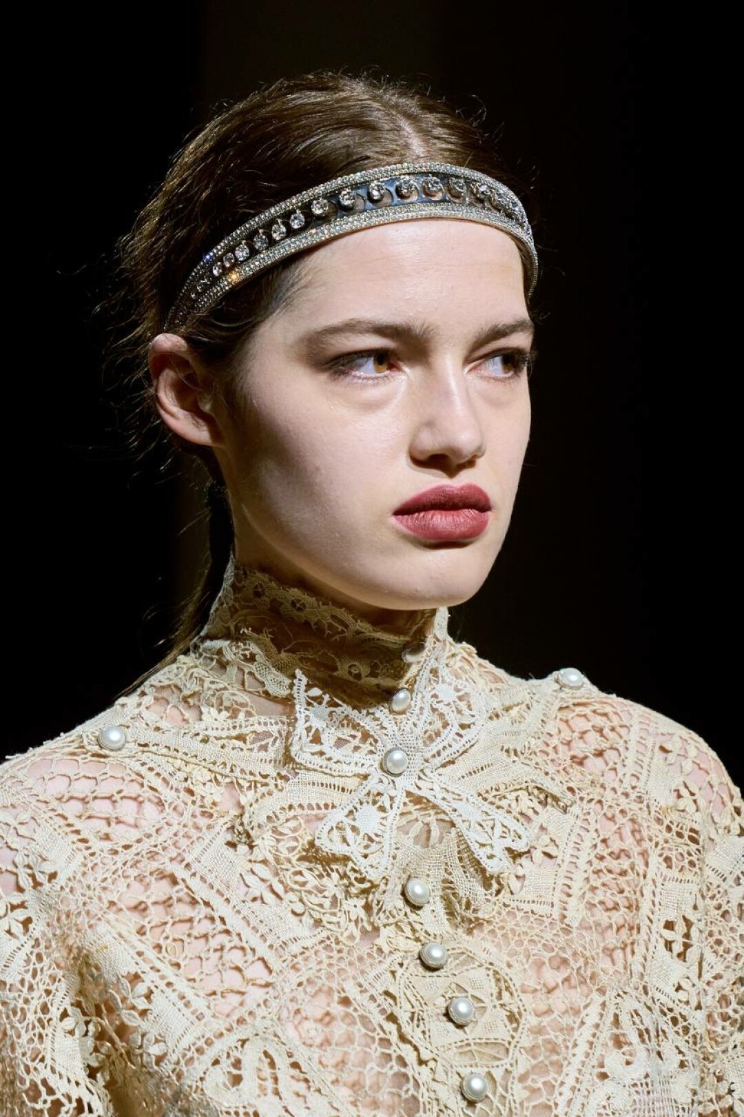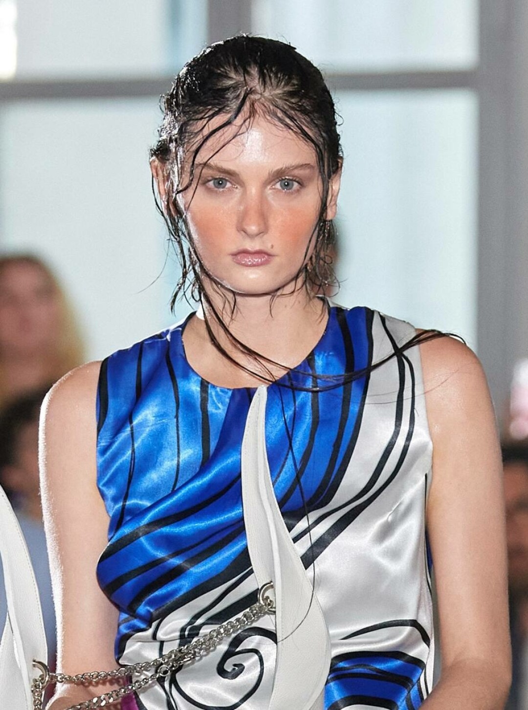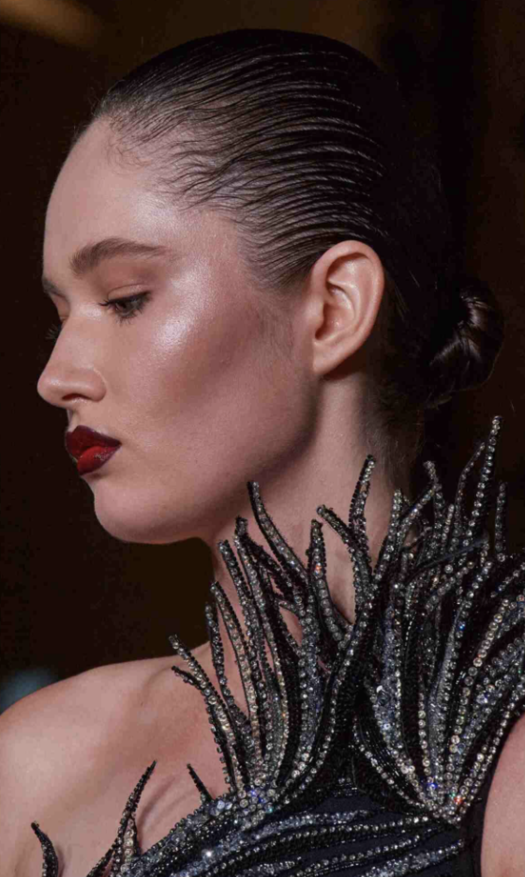 Сияющая кожа (а заодно и губы) – тот самый эффект глазированного пончика – точка, в которой сходятся вкусы тиктокеров и визажистов с мировыми именами. Масло для тела и хайлайтер – маленькие помощники кутюра. Для самых смелых в Viktor & Rolf припасли перламутровую розовую помаду из ретро-косметички. Лайфхаки для городских условий: эффекта glowing skin легко добиться за счет добавления капли жидкого хайлайтера в увлажняющий тон, а неоновую помаду могут заменить перламутровые тени в дуэте с блеском для губ.