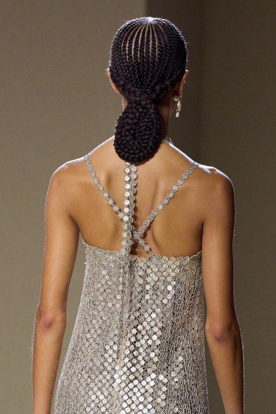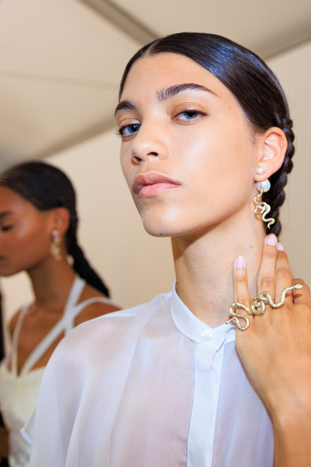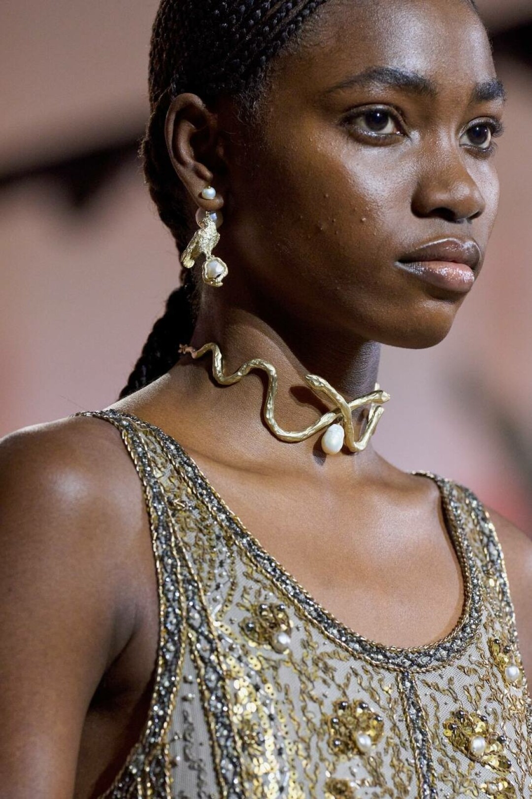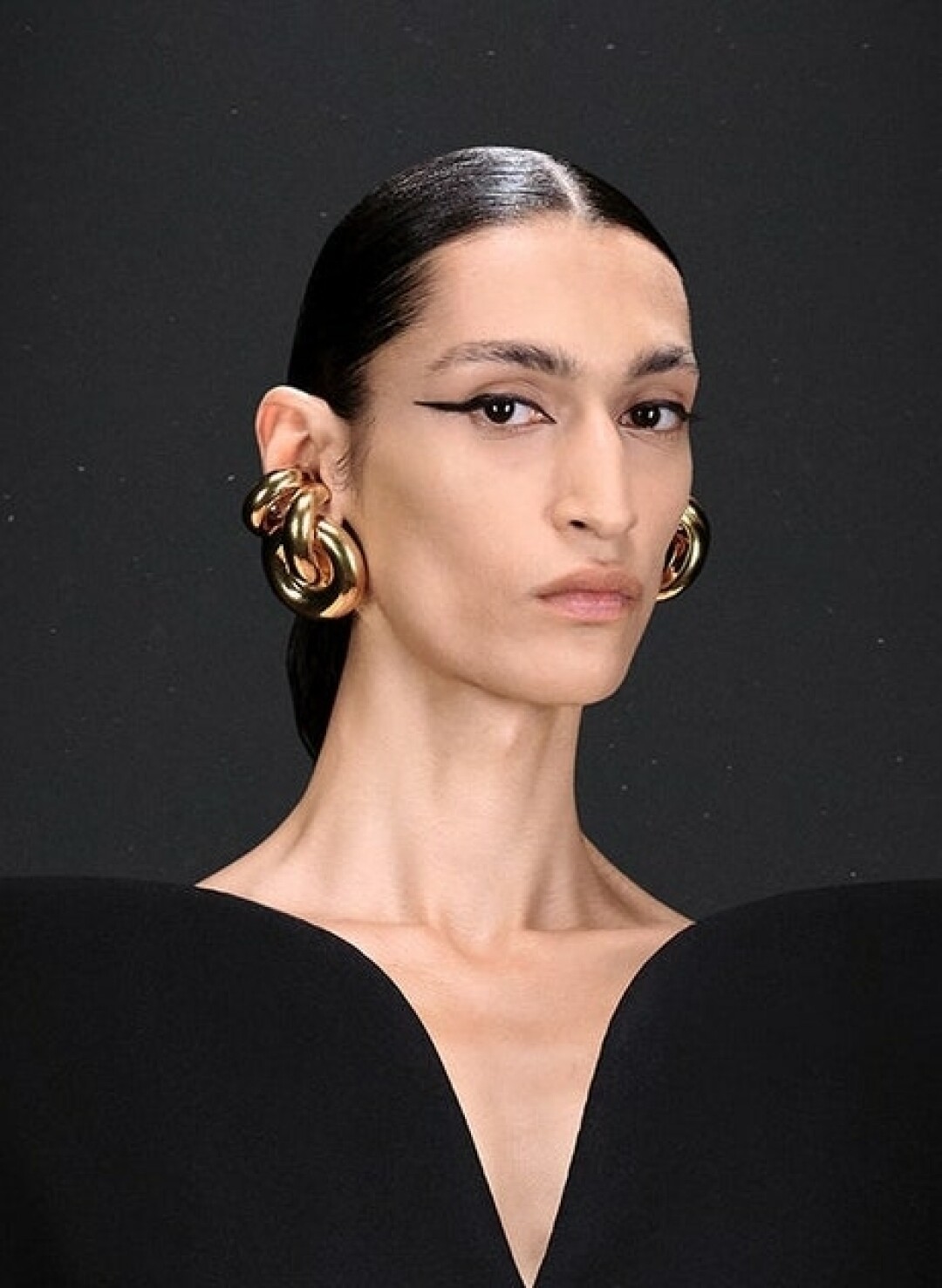 Сияющая кожа (а заодно и губы) – тот самый эффект глазированного пончика – точка, в которой сходятся вкусы тиктокеров и визажистов с мировыми именами. Масло для тела и хайлайтер – маленькие помощники кутюра. Для самых смелых в Viktor & Rolf припасли перламутровую розовую помаду из ретро-косметички. Лайфхаки для городских условий: эффекта glowing skin легко добиться за счет добавления капли жидкого хайлайтера в увлажняющий тон, а неоновую помаду могут заменить перламутровые тени в дуэте с блеском для губ.
