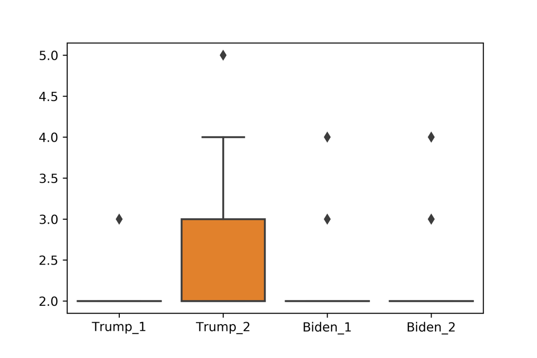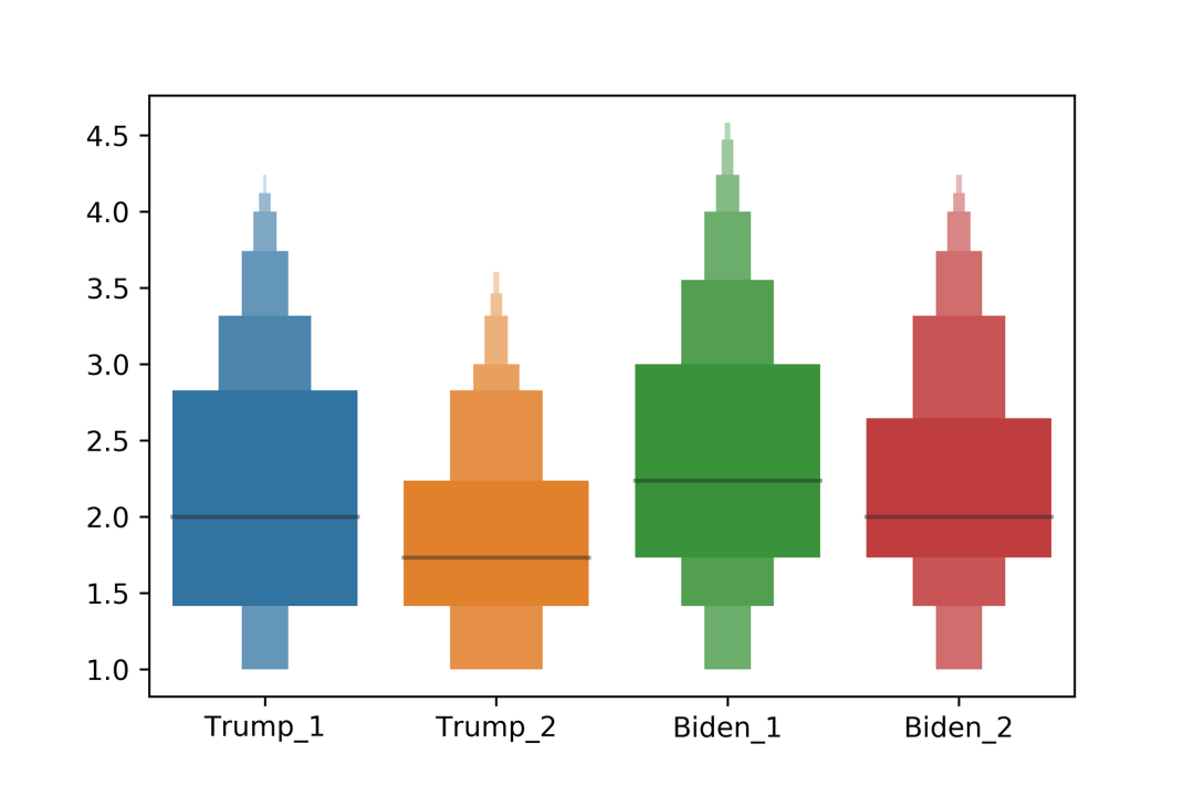Распределения полученных для всех слоговых длин результатов по собеседникам и турам визуализированы на графике 3. Мы видим, что показатель Трампа во втором туре дебатов является самым низким — с медианой 1.7. Иными словами, степень близости ритмической структуры его предложений является максимальной.