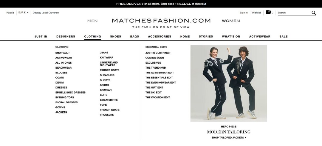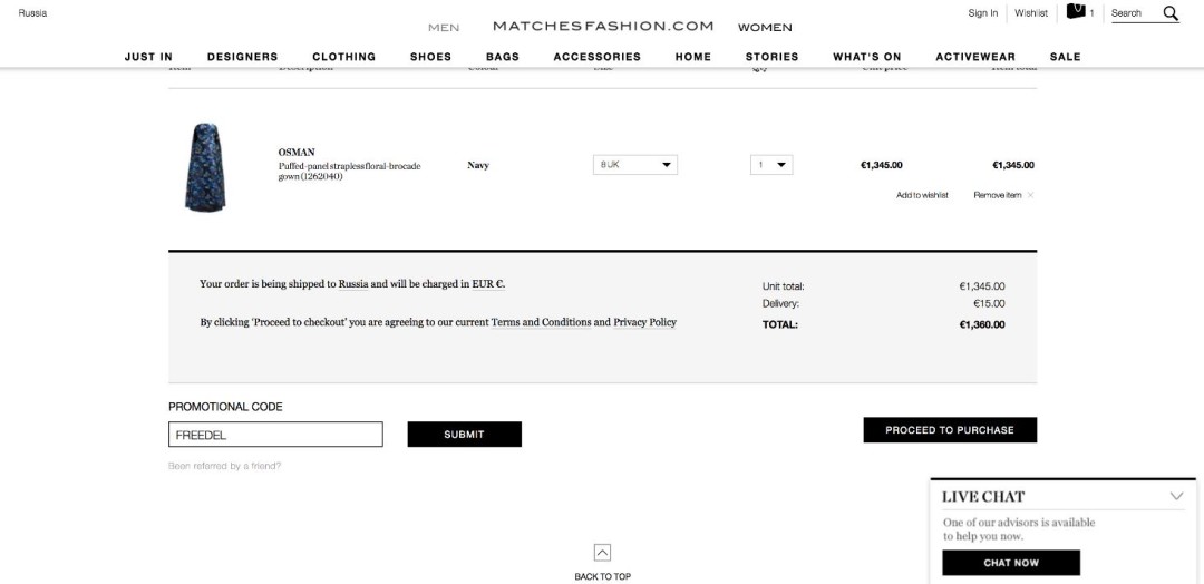 Выбирая подарок для своей сестры на выпускной вечер, остановилась на британском matchesfashion.com. Здесь есть акции, которые на других сайтах онлайн-шоппинга встречаются значительно реже: бесплатная доставка плюс еженедельные скидки. Для незарегистрированных пользователей бонусом выпадет только freedelivery – бесплатная доставка. Если же подписаться на рассылку, то от магазина будет приходить еженедельное уведомление о горячихсейлах и не только.