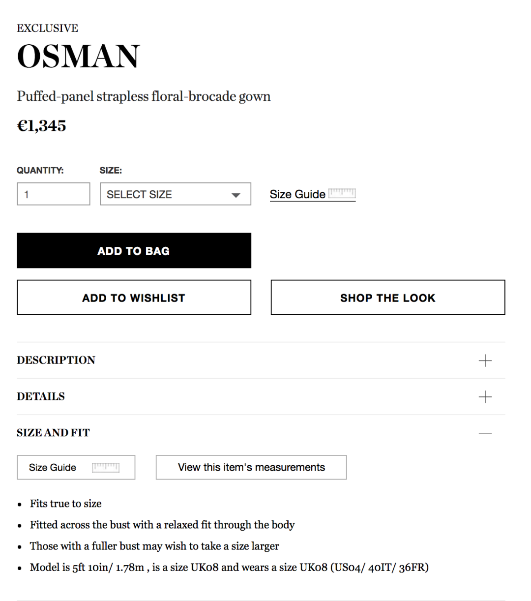Цель сегодняшнего шопинга – выбрать платье для торжественного мероприятия. На главной странице выбираю раздел Gowns. Это большая подборка платьев для особых случаев. Внимательно читаю характеристики понравившегося платья бренда Osman за 1345 €.