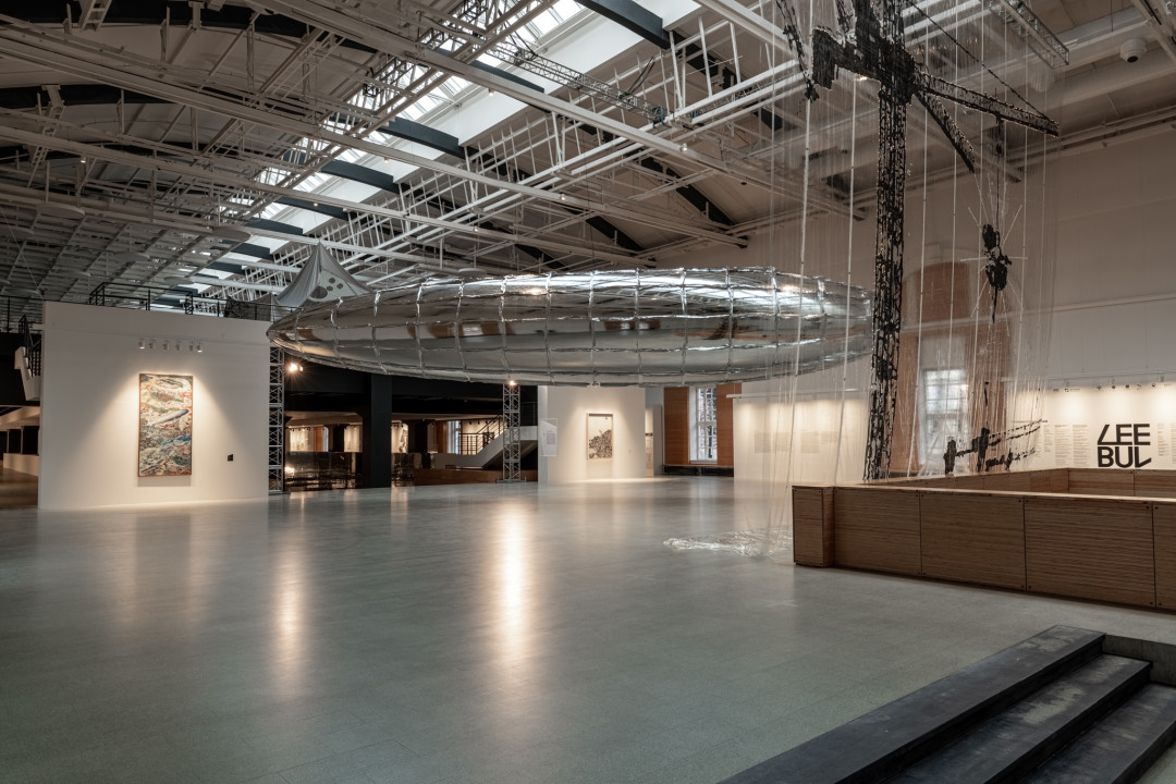 Огромный блестящий дирижабль, который первым встречает посетителей, становится одновременно и метафорой этой нашей ностальгии по будущему, и приговором визионерству, так как отсылает нас к трагическому крушению «Гинденбурга» в 1937 году. Как и в других работах серии «Желание быть уязвимым», представленной на выставке, Ли Бул использует знакомые и считываемые коды эпохи модернизма – дирижабли, эстетика всемирных ярмарок и цирков; блестящие поверхности, отсылающие нас к «Космической Одиссее». «Желание быть уязвимым» идеологически сталкивается со второй серией, иронично названной «Мое великое повествование», где представлены эскизы и макеты художницы. Она отсылает нас уже к постмодернизму, с его невозможностью существования одного нарратива и великих повествований в принципе – Лиотар, философ-постструктуралист, определяет постмодерн как кризис метанарративов. Ли Бул вступает в спор с этой идеей Лиотара и предлагает своеобразный архив утопических идей, от Хрустального дворца Пакстона – сооружения из стекла и железа, построенного в 1851 году к Всемирной выставке в Лондоне и ставшего на тот момент архитектурным и философским чудом, до Татлина и Таута.