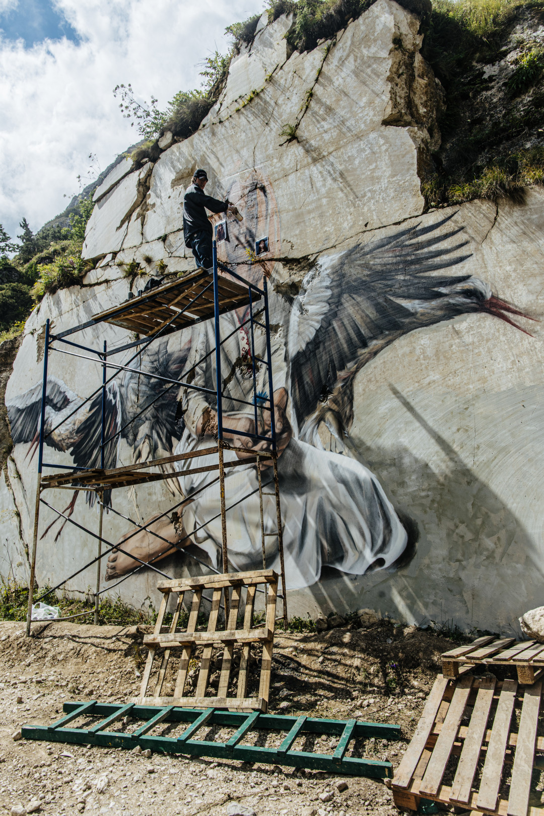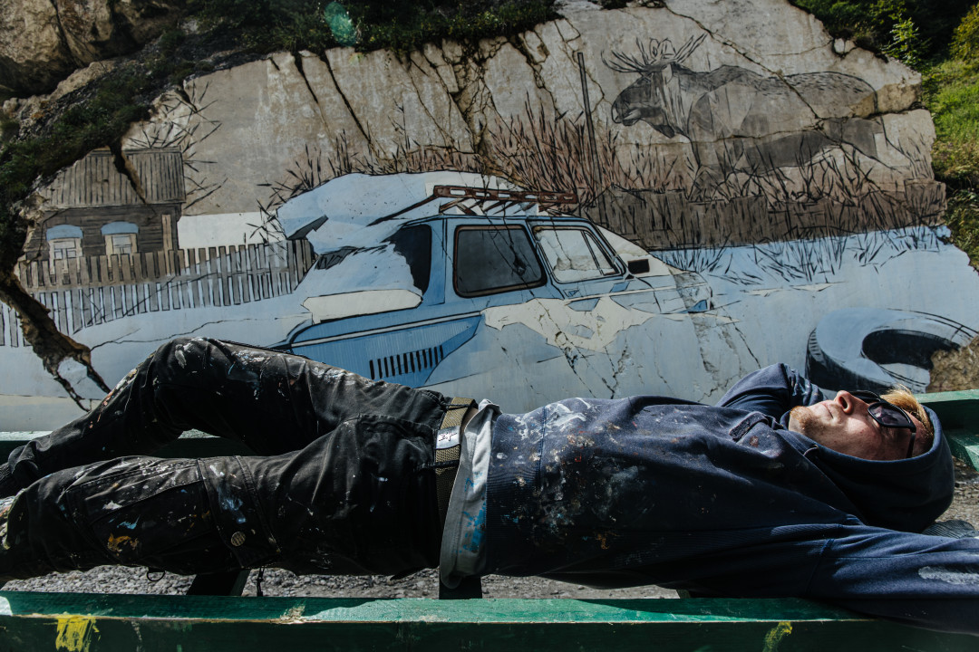 Когда готовились к фестивалю, нам показывали локации на фото: решил, что скала небольшая, а в итоге она оказалась гигантская. Моя работа, пожалуй, одна из самых масштабных, высотой примерно в четыре этажа. Не скрою, было страшно, но дико интересно. Мне установили леса в 4 яруса, волонтеры держали их внизу, подставляли камни для равновесия, но чем выше я поднимался, тем неустойчивее была конструкция. На самый верх я даже не забирался, все делал с помощью валиков.