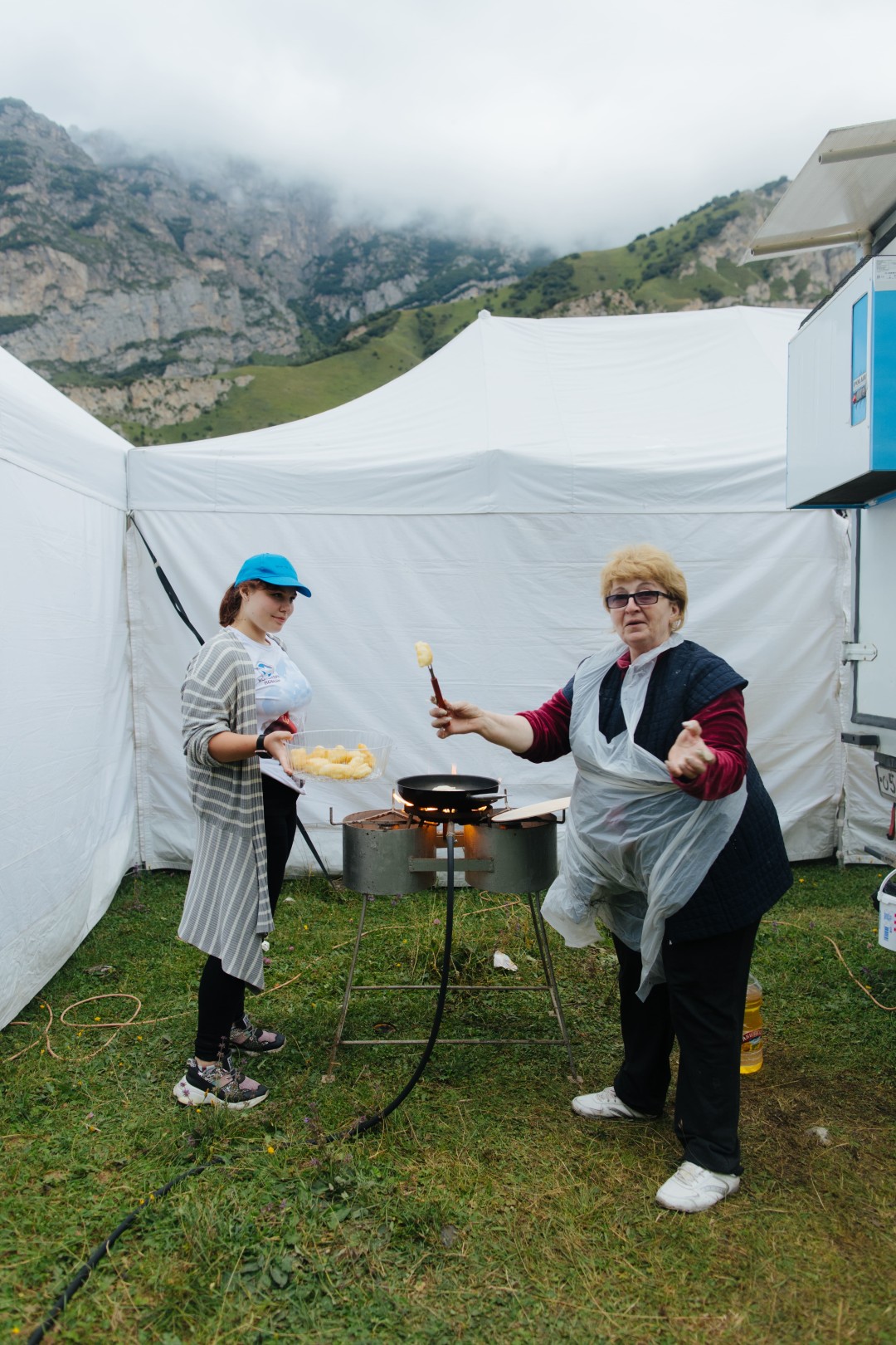 Для участников фестиваля разбили настоящий палаточный лагерь на склоне горы, куда украдкой время от времени заглядывали то табуны белых лошадей, словно из сказки, то вольные коровы с быками. Чуть ниже в ущелье расположили стихийный душ (холодный и бодрящий) и шатер с полевой кухней от уже ставшей легендой повара Залины (поверьте на слово, ее темперамент, помноженный на картошку с мясом на завтрак — веский повод бросить все и уйти обратно в горы). На территории дежурила скорая помощь и сотрудники левобережного отдела полиции. По вечерам художники собирались на «лобном месте» у костра, где обсуждали, как протекает работа и пели песни под гитару.