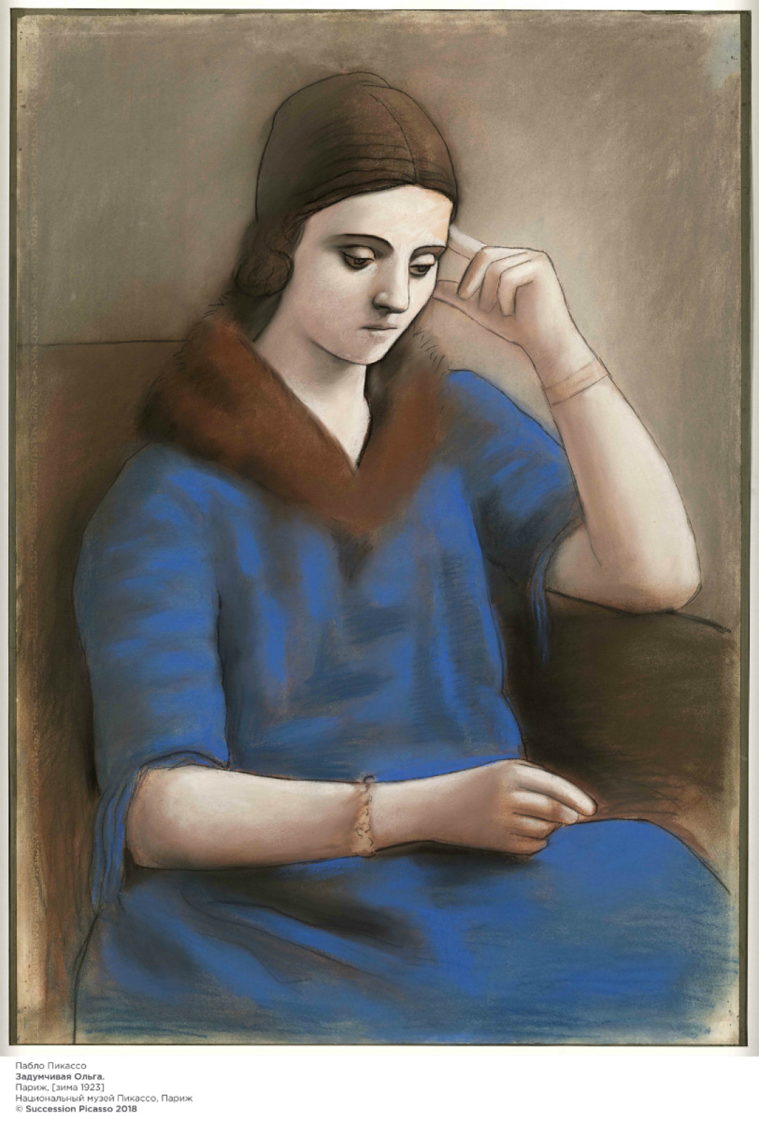 Впервые эта выставка прошла в 2017 году к столетию знакомства Пабло Пикассо и его первой официальной жены Ольги Хохловой в Национальном музее Пикассо в Париже. В конце ноября она открылась в ГМИИ имени Пушкина. Говорят, что задумывалась эта тема для примирения двух образов – «страдающей и грустной жены», как воспринимали Ольгу в России, и «истеричной и портящей гению кровь особе», какой ее видели в Европе. На выставке можно увидеть живопись, наброски, фотографии, письма, работы, которые раньше никогда не показывались в России. И проследить великую историю любви: как Пикассо изображал Хохлову, когда был в нее безумно влюблен, и как она менялась в его творчестве, когда он стал к ней охладевать или даже, может быть, ненавидеть. Окончательно расстались они в 1935 году, несмотря на то, что официально оставались женаты вплоть до смерти Ольги в 1955 году.
