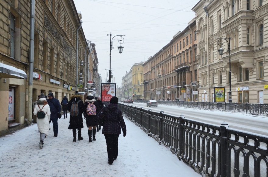 А мы приближаемся к оживленному перекрестку трех проспектов. Направо от Невского отходит Владимирский проспект, налево — Литейный.