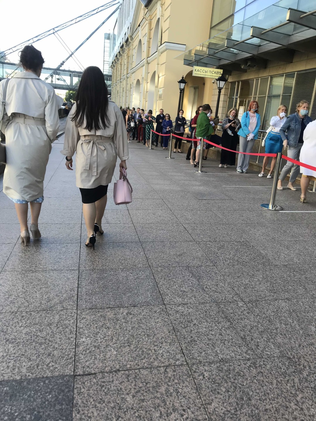 Спустя полчаса ожидания очередь начинает медленно двигаться — запускают небольшими партиями человек по 10. Перед заветной зоной, выстроенной у стеклянного входа, сотрудницы Мариинского театра раздают всем, кто не позаботился заранее о средствах защиты, маски и перчатки. Их советуют сразу надевать: «Вас внутрь без них все равно не пустят». За расстоянием между зрителями в очереди здесь начинают следить более внимательно: просят не заходить за ограничительные линии. Несмотря на сложности с показом электронных билетов на смартфонах — в перчатках это и правда не так просто — здесь уже система работает быстро и отлажено. Дальше традиционные рамки, которые, кстати, тоже когда-то просто стали новой нормой. Мог ли кто-нибудь представить их в театре, скажем, в 1960-е? Наконец, последнее препятствие — медицинским тепловизором улыбчивые женщины в защитных костюмах с экраном меряют температуру. Получив заветные 36,6, зрители поднимаются в зал. Фотографироваться на фоне янтарных стен и люстр с шариками в масках капельдинеры просят быстрее — толпиться в фойе запрещено.