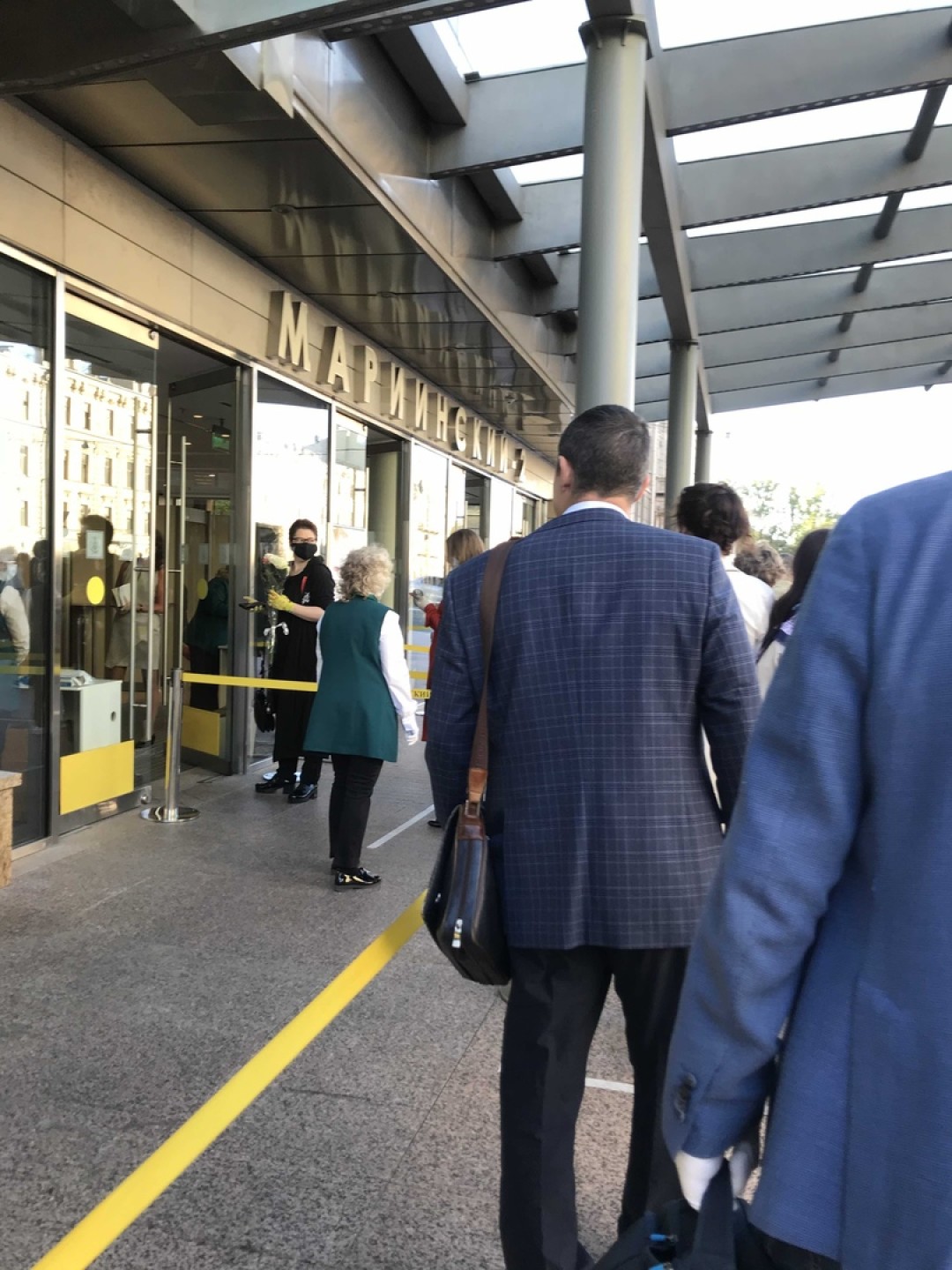 В пандемические времена театр начинается не с вешалки, а с очереди — чтобы попасть в Мариинский-2, ее нужно отстоять минут 30, даже если пришел заранее. В ней люди стараются быть на расстоянии друг от друга, но о полутора метрах речи, конечно, не идет. Единицы заранее надели маски и перчатки, те, кому явно больше 65 лет, стоят без них и наравне с беременными и детьми. Соскучившиеся по культурной жизни в офлайне петербуржцы приходят целыми семьями, хотя сидеть вместе все равно нельзя: максимальная близость — через кресло. Все заметно оживлены, и даже промозглый ветер с Крюкова канала не портит предвкушения концерта. Соседи по очереди признаются редактору «Собака.ru», что идти «немного страшно», но добавляют «все же везде гуляют, а так хоть удовольствие получишь».