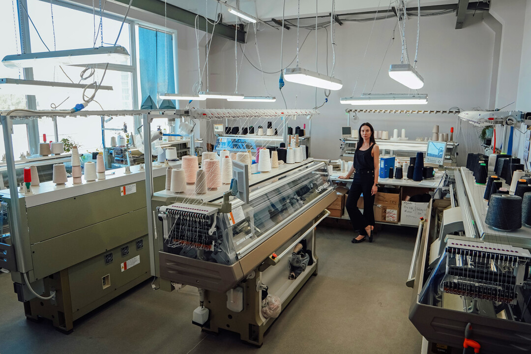 Юлия Жукова на производстве AND The Brand показывает японские вязальные машины Shima Seiki