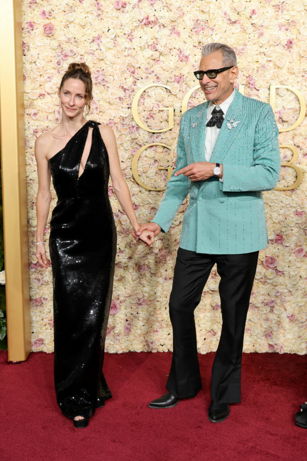 Помимо классических (и не очень) костюмов Дэниела Крейга (двубортный Loewe), звезды «Аноры» (и октябрьской обложки Собака.ru!) Марка Эйдельштейна (атласный Prada) и Эдриана Броуди (тройка с супер-брошью!) у мужчин явно в почете Tiffany Blue — Эндрю Скотт вышел в total look Vivienne Westwood, Джефф Голдблюм выбрал ментоловый жакет с дорожками страз и замиксовал его с клешами в духе 70-х, а Джереми Стронг — велюровый сет Loro Piana с панамой и ретро-оправой в тон.