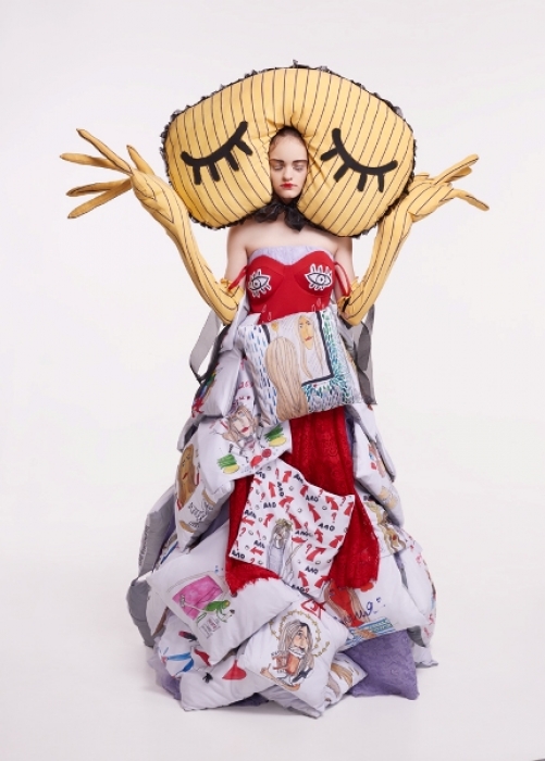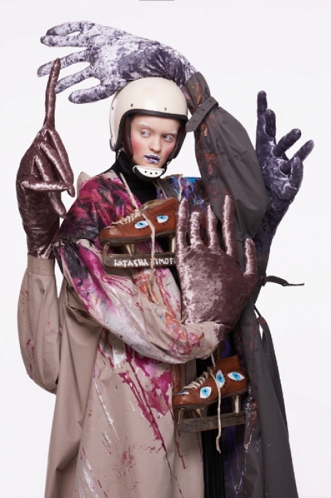 Последние два носят платья и огромные маски. «Мечтатель» — то, что собрано из подушек с изображениями прожитых дней дизайнера. «Многоликий» расшит лицами и частями тела кукол – привет из детства. «Идея раздвоения личности не нова: в каждом из нас живут совершенно разные люди. Только мои все с большими руками, которыми мы и творим свою судьбу», — объясняет Тимофеева.