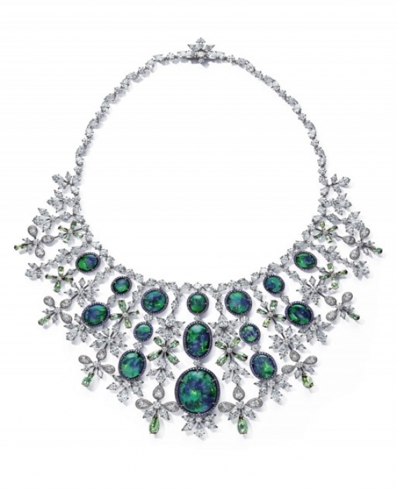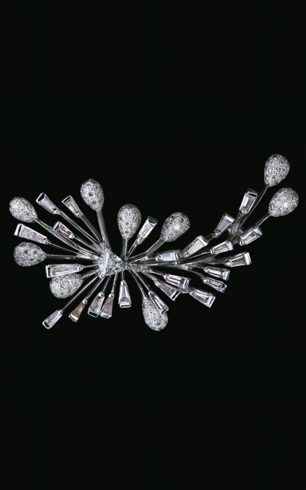 Удивительный оптический эффект демонстрируют двадцать четыре акварельных мазка желтыми и голубыми бриллиантами плюс брызги круглых белых весом полкарата. Издалека они складываются в брошь, вблизи — в тру арт.