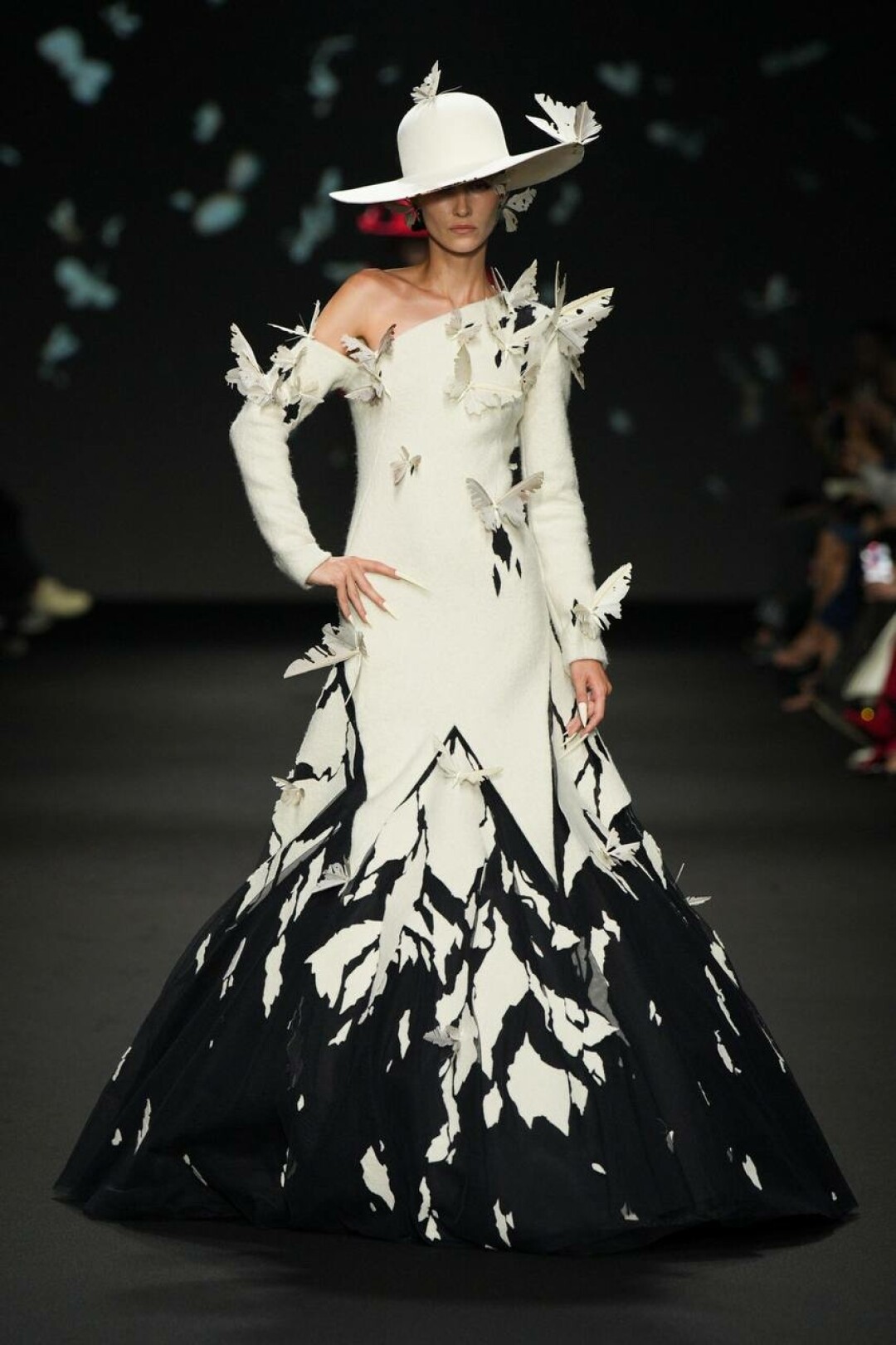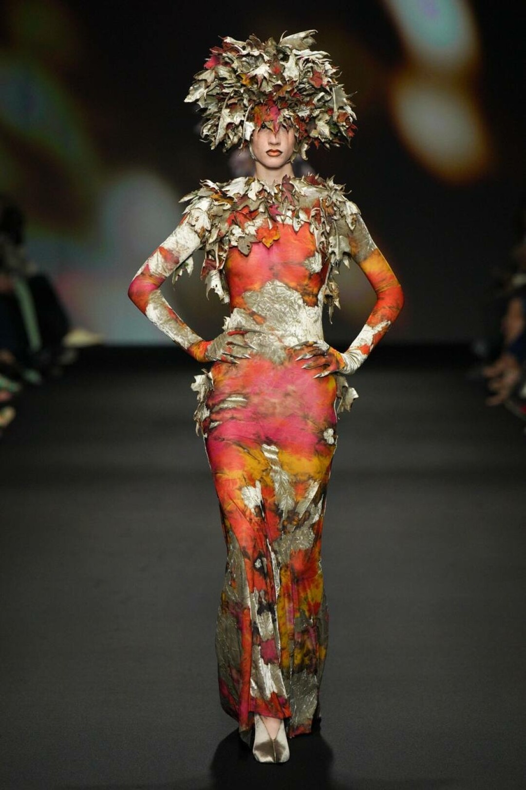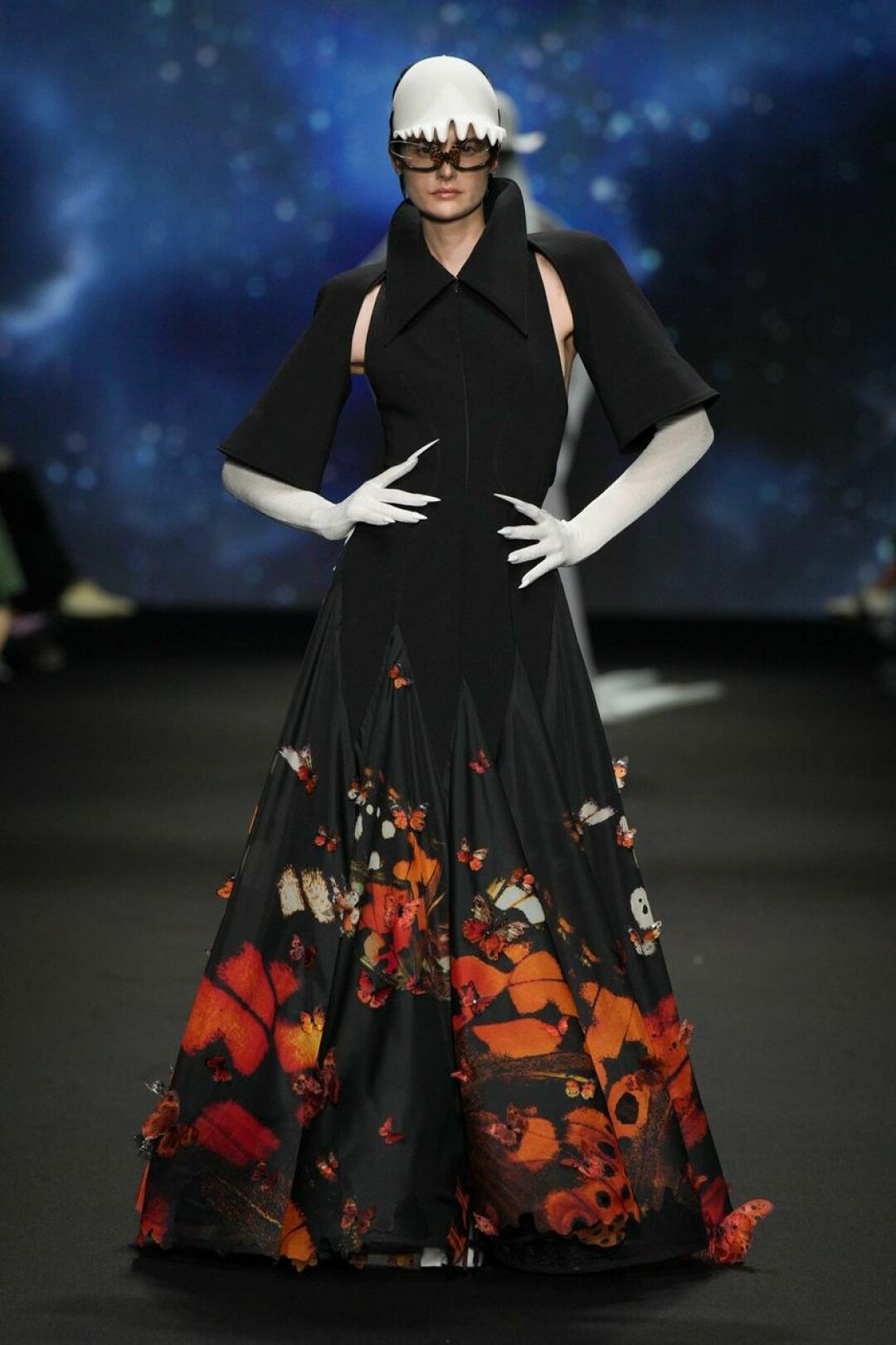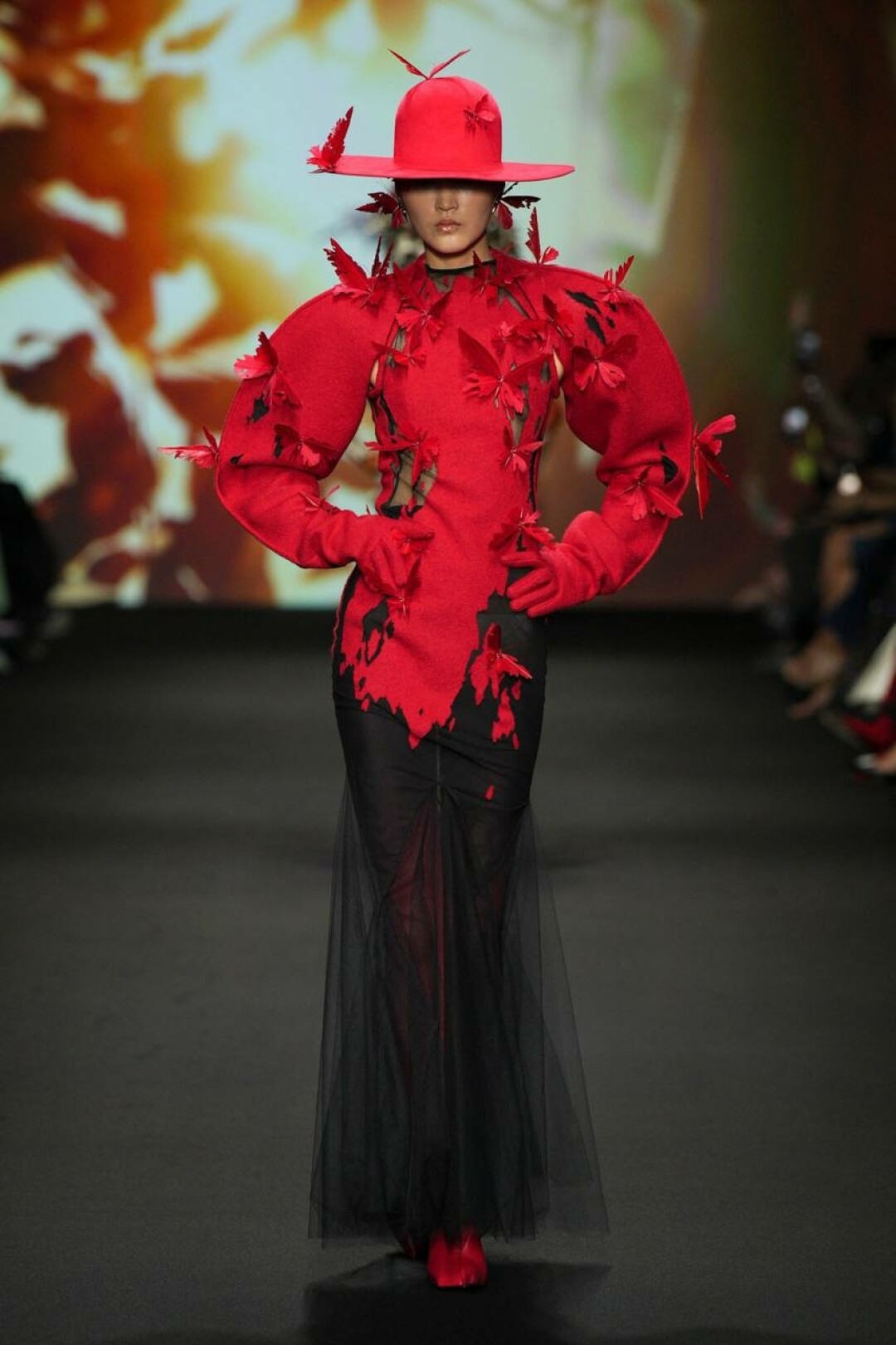 Усыпанные снегом и обледенелые зонты, пальто и вуали (продолжение темы прошлой кутюрной коллекции) сменялись весенним цветением сакуры, опадающей со все того же зонта (травма от английской погоды на лицо!) на плечи платья. За летний дресс-код отвечали десятки бабочек на пальто, шляпах и подолах платья. В экспериментах с температурами Вун не останавливается на обморожении, а с увлеченностью пироманьяка проверяет на огнеустойчивость плиссированные юбки и сложносочиненные корсеты (выполнено профессионалами, не пытайтесь повторить дома!). В отличие от намеков на другие сезоны с осенью дизайнер не церемонится и выводит на подиум оживший листопад: облегающее фигуру платье, напоминающее лужи с отражением пожелтевших деревьев, и головной убор облеплены кленовыми листьями.