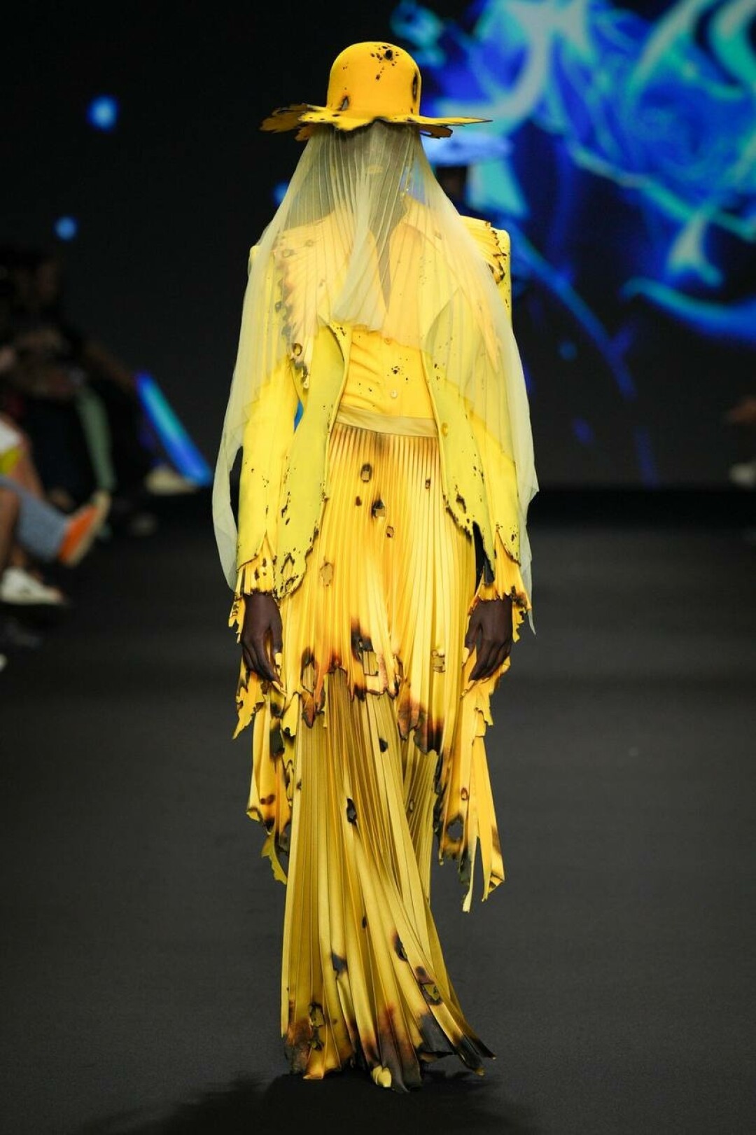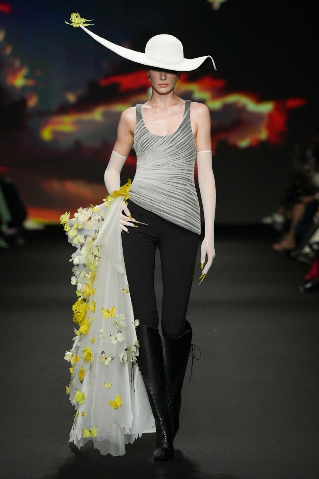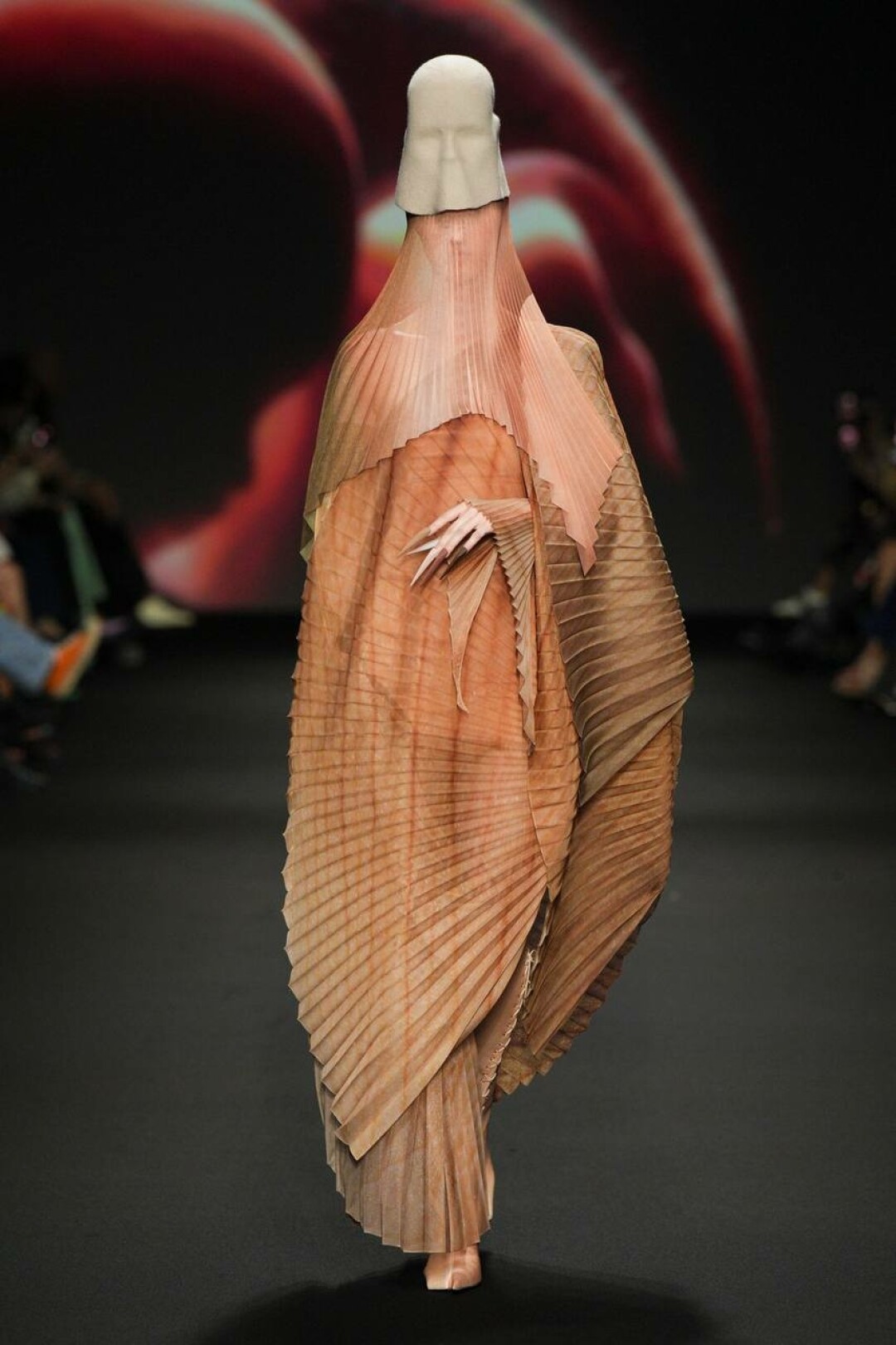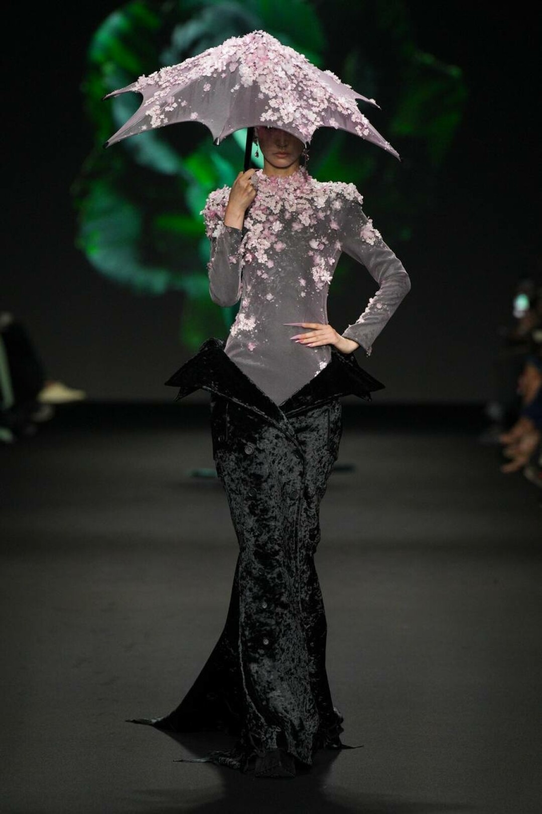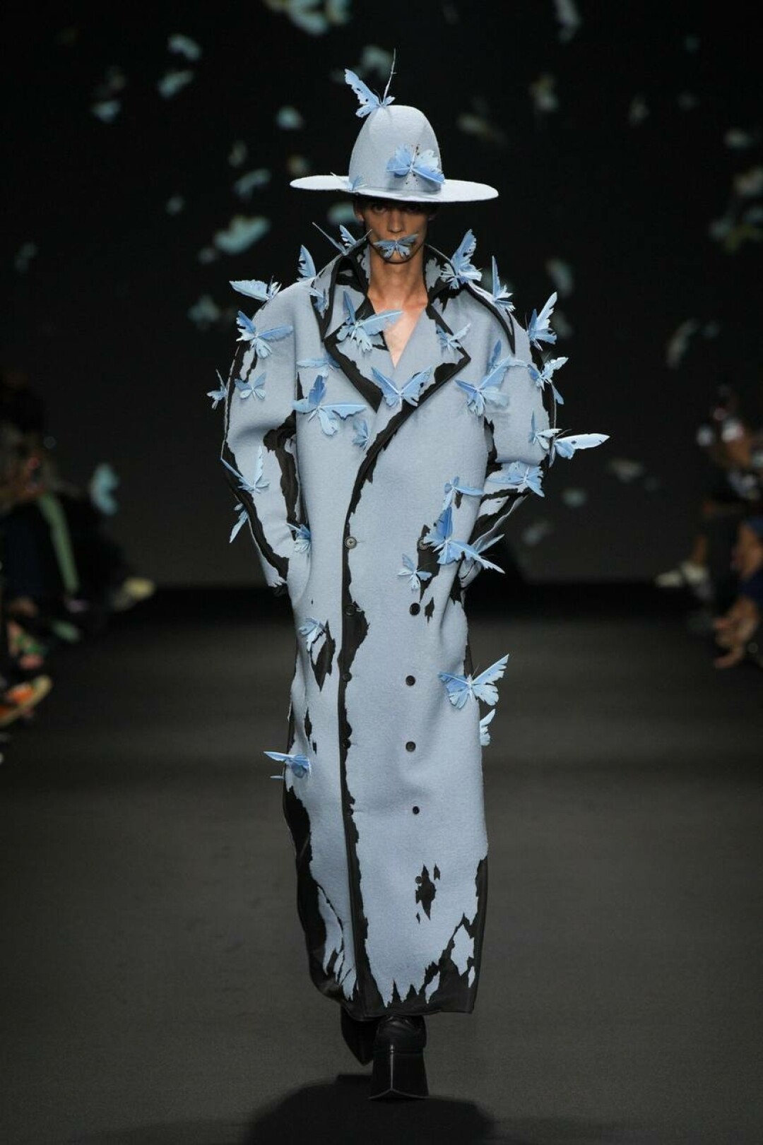 Усыпанные снегом и обледенелые зонты, пальто и вуали (продолжение темы прошлой кутюрной коллекции) сменялись весенним цветением сакуры, опадающей со все того же зонта (травма от английской погоды на лицо!) на плечи платья. За летний дресс-код отвечали десятки бабочек на пальто, шляпах и подолах платья. В экспериментах с температурами Вун не останавливается на обморожении, а с увлеченностью пироманьяка проверяет на огнеустойчивость плиссированные юбки и сложносочиненные корсеты (выполнено профессионалами, не пытайтесь повторить дома!). В отличие от намеков на другие сезоны с осенью дизайнер не церемонится и выводит на подиум оживший листопад: облегающее фигуру платье, напоминающее лужи с отражением пожелтевших деревьев, и головной убор облеплены кленовыми листьями.