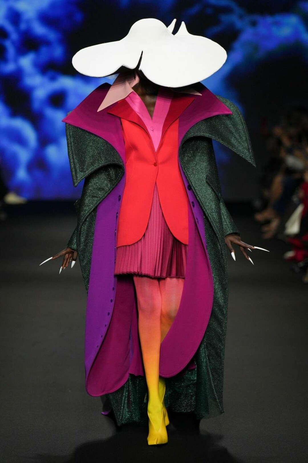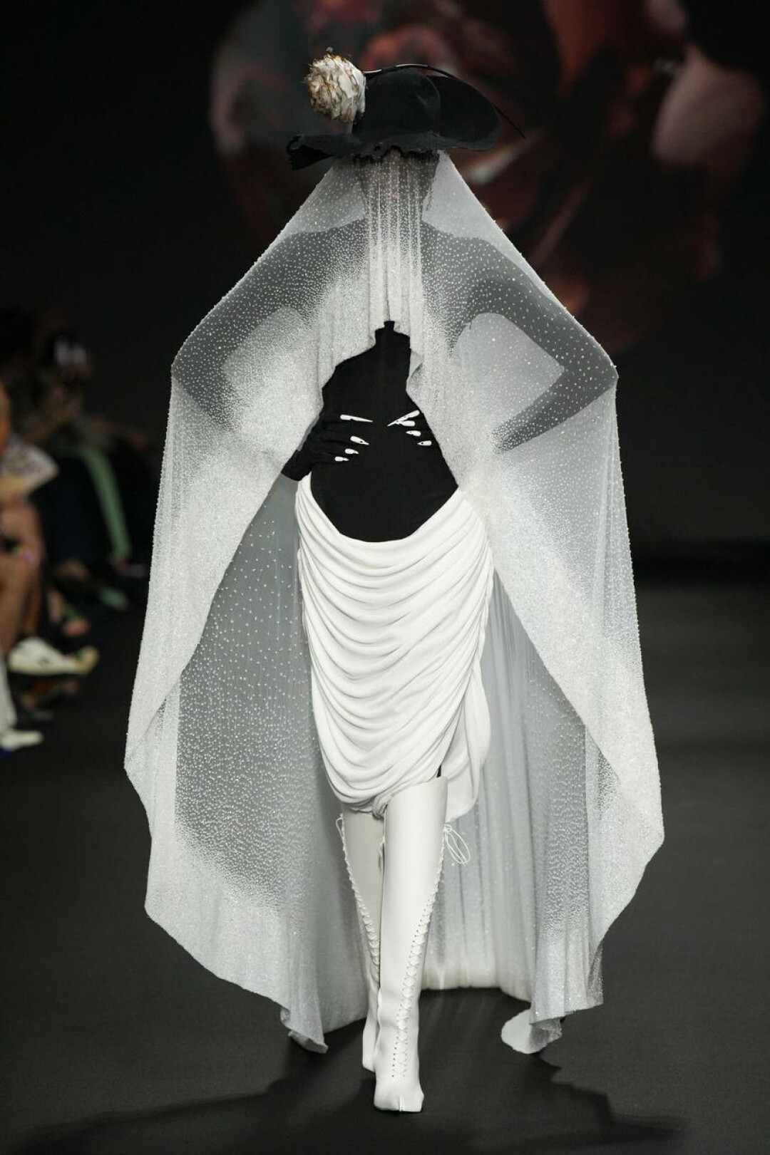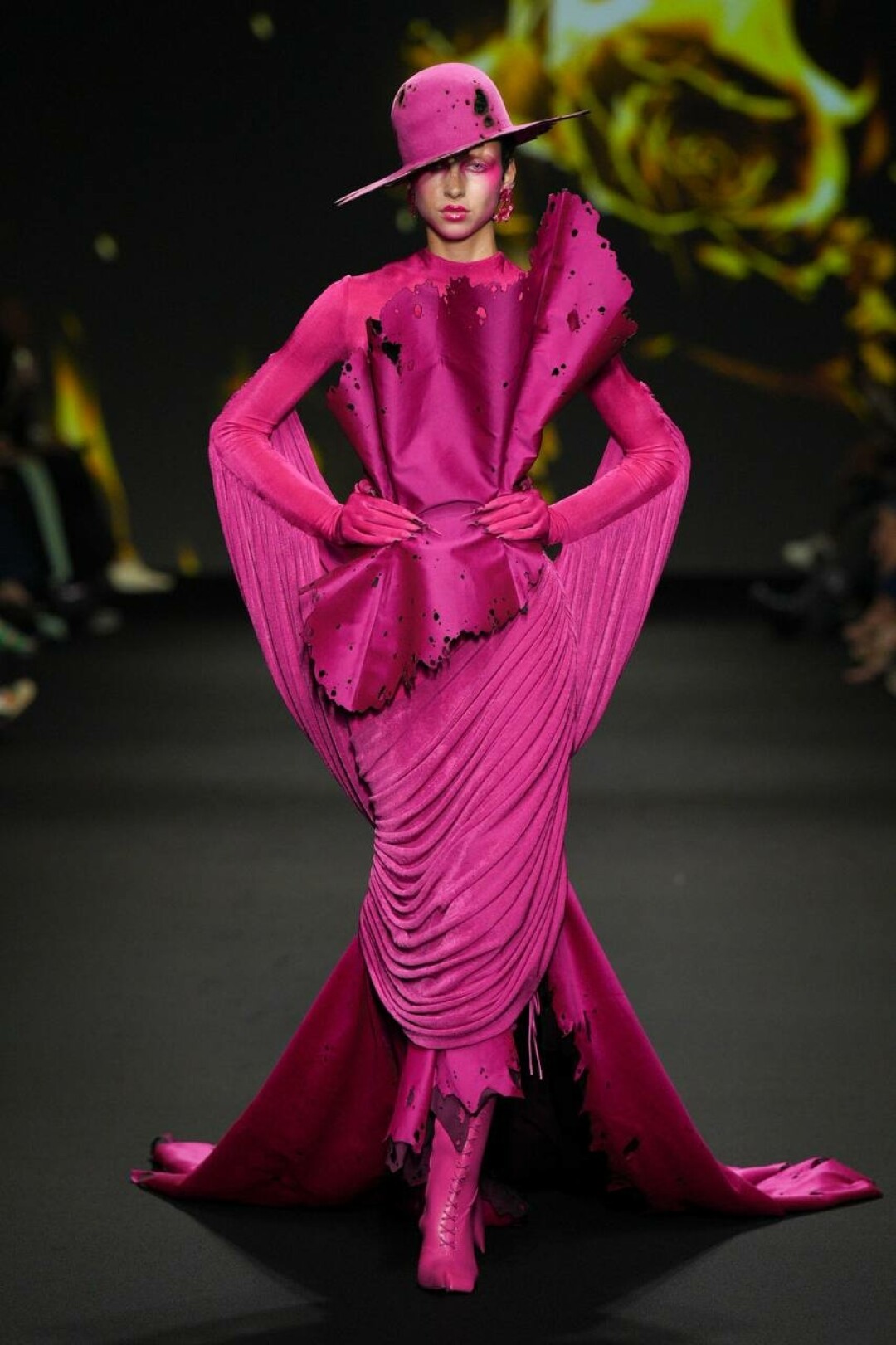 Вун вновь показал филигранную работу с тканью и формой — наслаивает драпировки на юбках, деконструирует лифы на корсетах и нагромождает друг на друга два пальто (more is more!). Любимые стейтмент-аксессуары с показа — длинные перчатки, соединенные задрапированной тканью, с острыми ногтями (реверанс Эльзе Скиапарелли) и мегаброшь-цветок (вам ранункулюс или хризантему?).