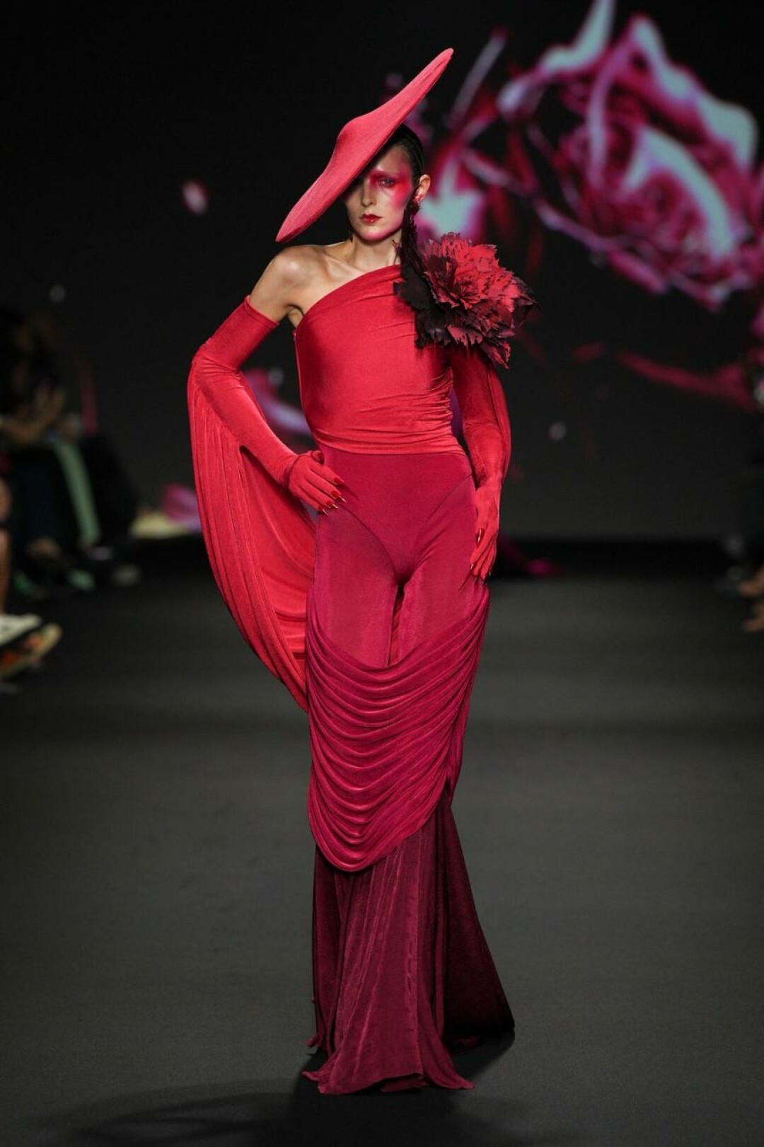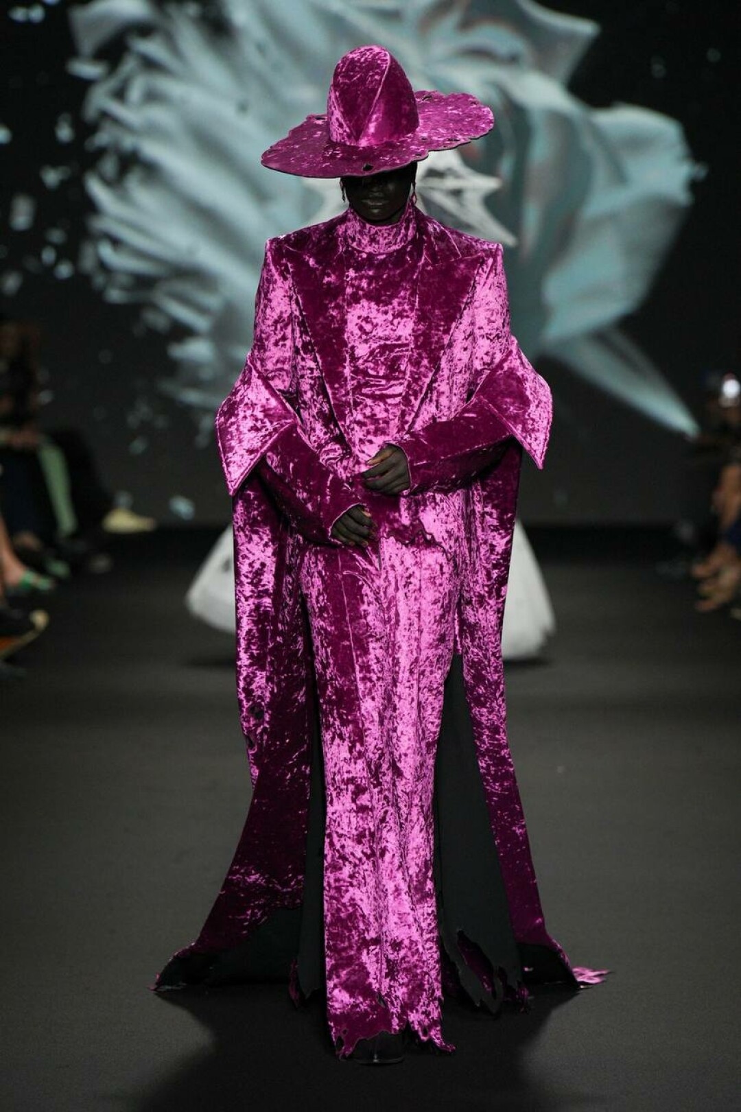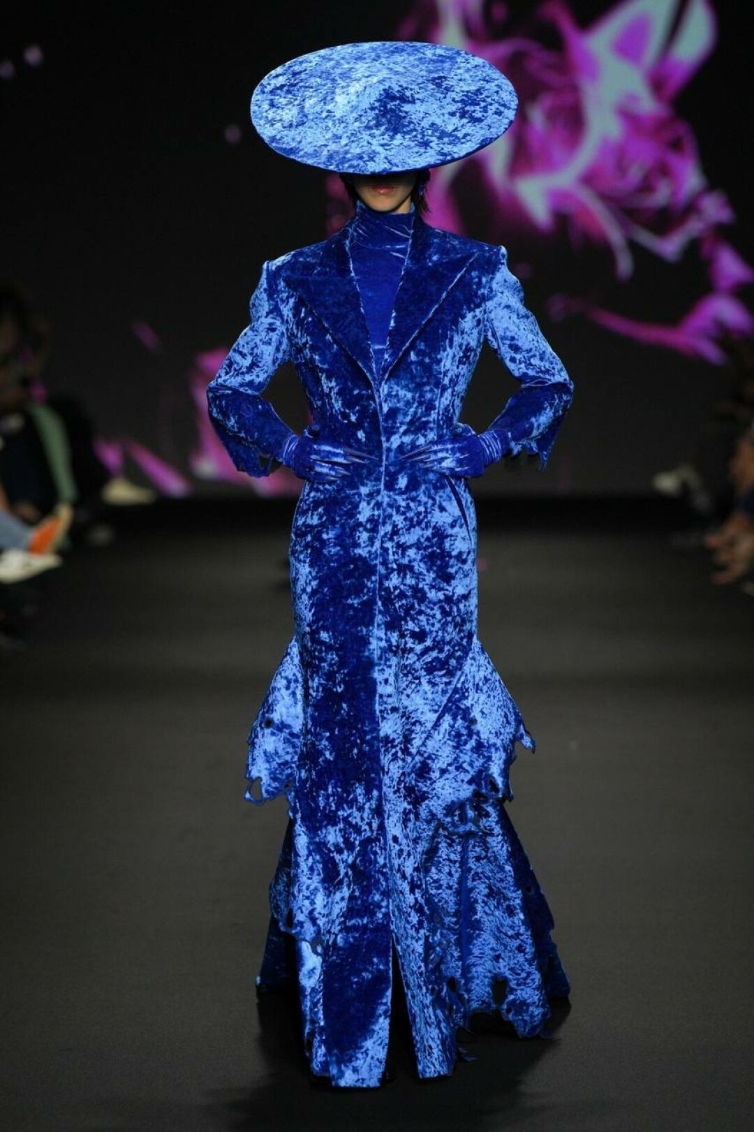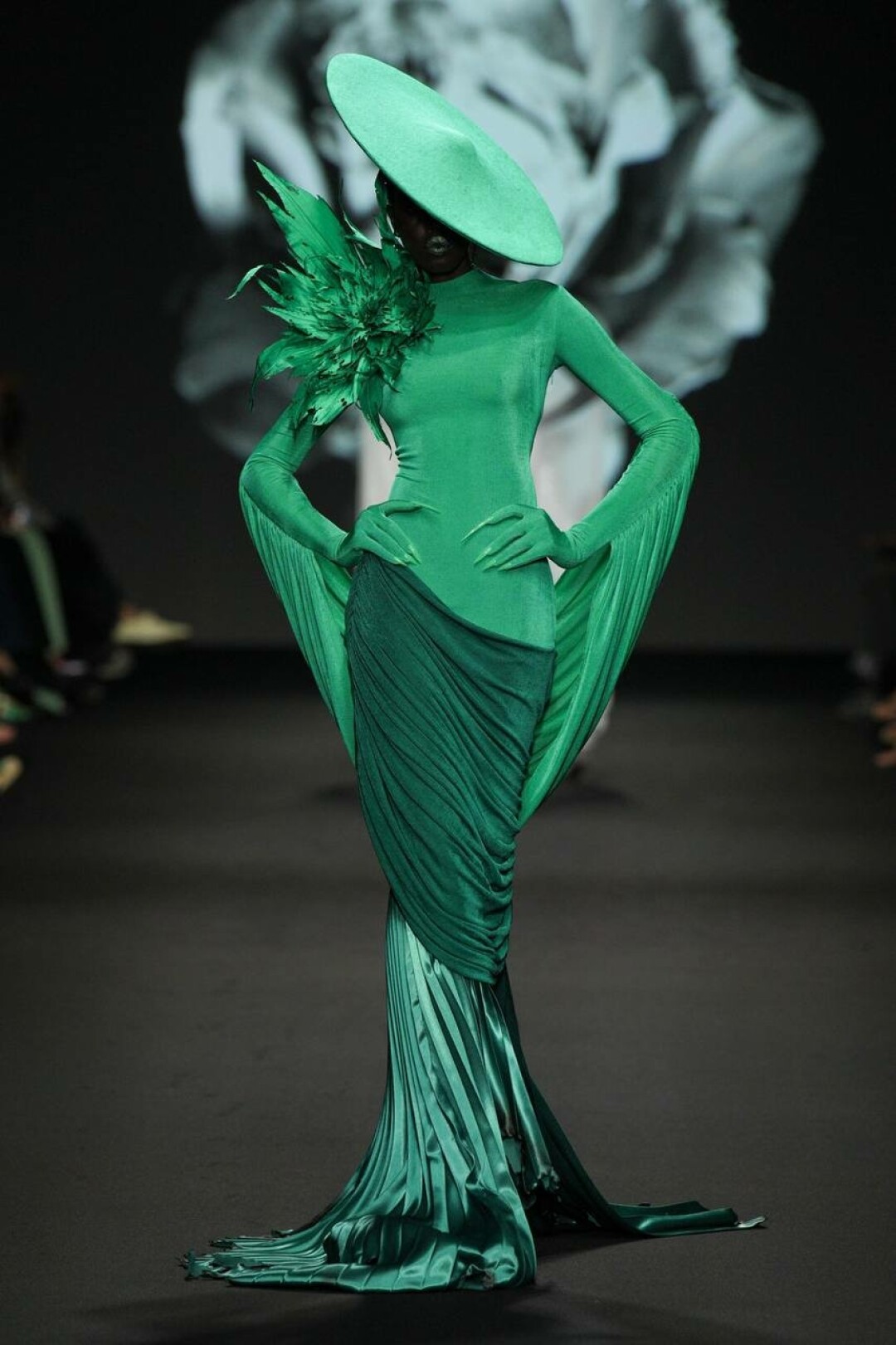 Вун вновь показал филигранную работу с тканью и формой — наслаивает драпировки на юбках, деконструирует лифы на корсетах и нагромождает друг на друга два пальто (more is more!). Любимые стейтмент-аксессуары с показа — длинные перчатки, соединенные задрапированной тканью, с острыми ногтями (реверанс Эльзе Скиапарелли) и мегаброшь-цветок (вам ранункулюс или хризантему?).
