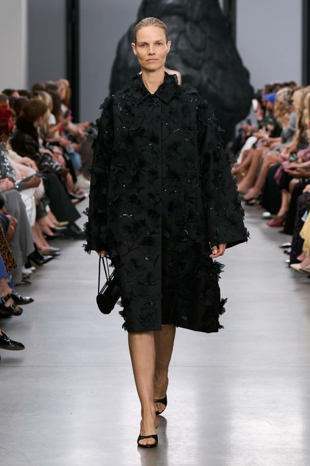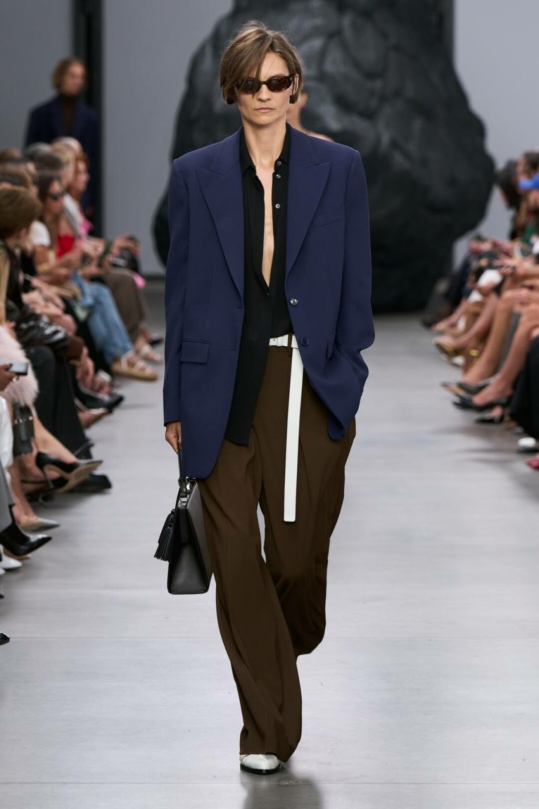 На мудборде к весенне-летней коллекции Michael Kors — нуарные кадры из нетфликсовского мини-сериала «Рипли» (про того самого талантливого Тома). Вместо привычных залитых солнцем итальянских пейзажей, знакомых по фильму Энтони Мингеллы 1999 года, Стивен Зеллиан показал средиземноморское побережье мрачным, глубоким и таинственным — оттуда и холодный сет-дизайн шоу Корса с монументальным булыжником. В остальном отсылки — больше условные, чем прямые. Его Мардж и Дикки — вольная интерпретация и смесь кино-героев и собственных фантазий на тему сельского quiet luxury. Старомодные бушлаты и ретро-двойки он подглядел у Дакоты Фаннинг, а платья-майо в духе 1950-х, лифы и пышные юбки с цветочным принтом — у ее предшественницы Гвинет Пэлтроу. Дикки переоделся в темно-синие пиджаки и пальто, струящиеся рубашки и помятые брюки и тренчи из плащевки.