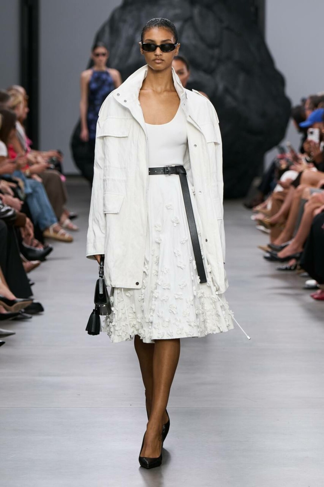 Наблюдаем засилие цветочного декора — объемные бутоны украсили расклешенные юбки (сочетает с ворквир-куртками), кружевные мини-платья и трикотажные джемперы, а флористические принты появились на однобортных плащах и прямых платьях из шелка. Летняя альтернатива лоферам — маскулинные остроносые сандалии, которые Корс миксует с кремовой двойкой из объемного жакета и бермудов.
