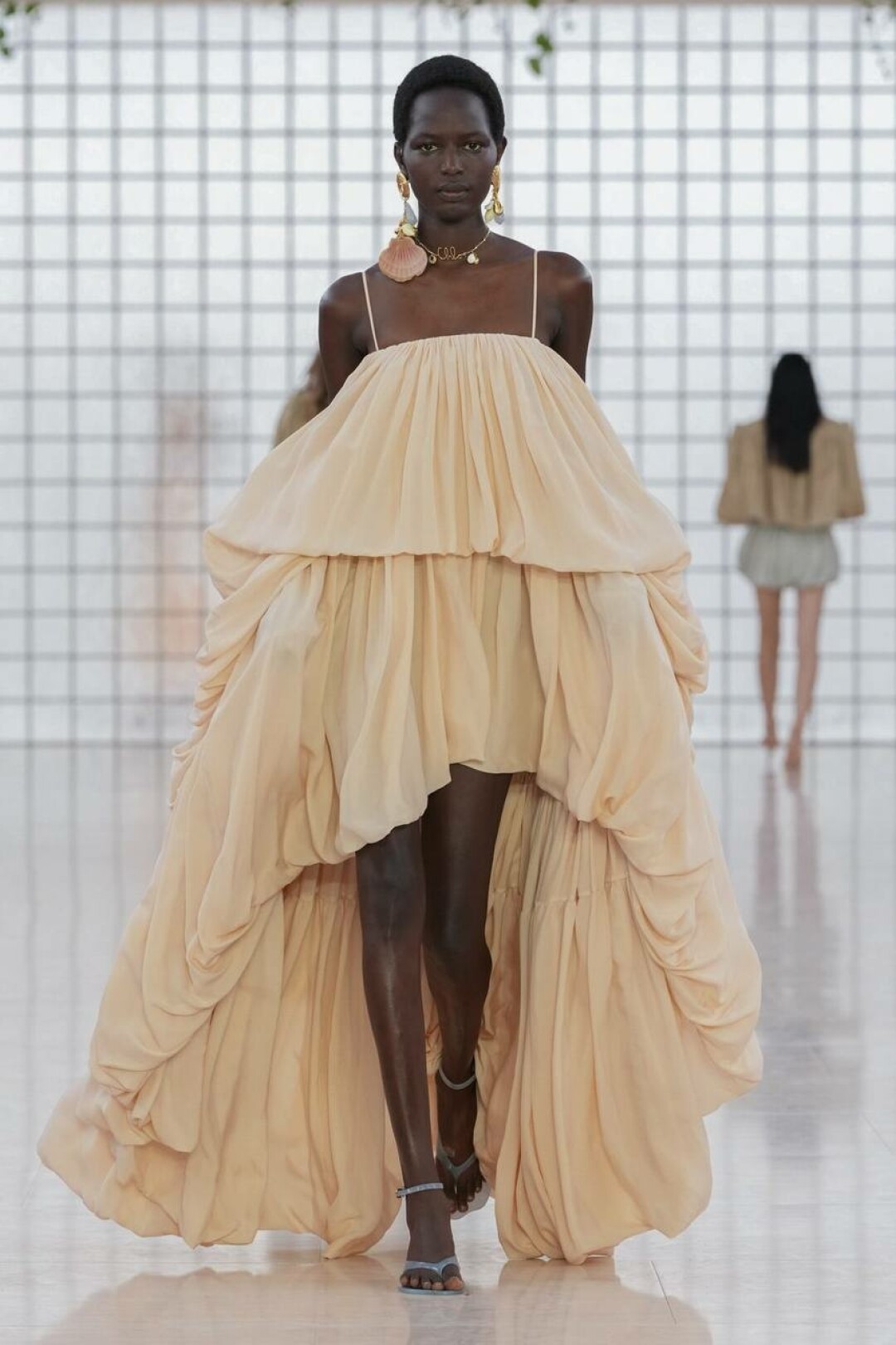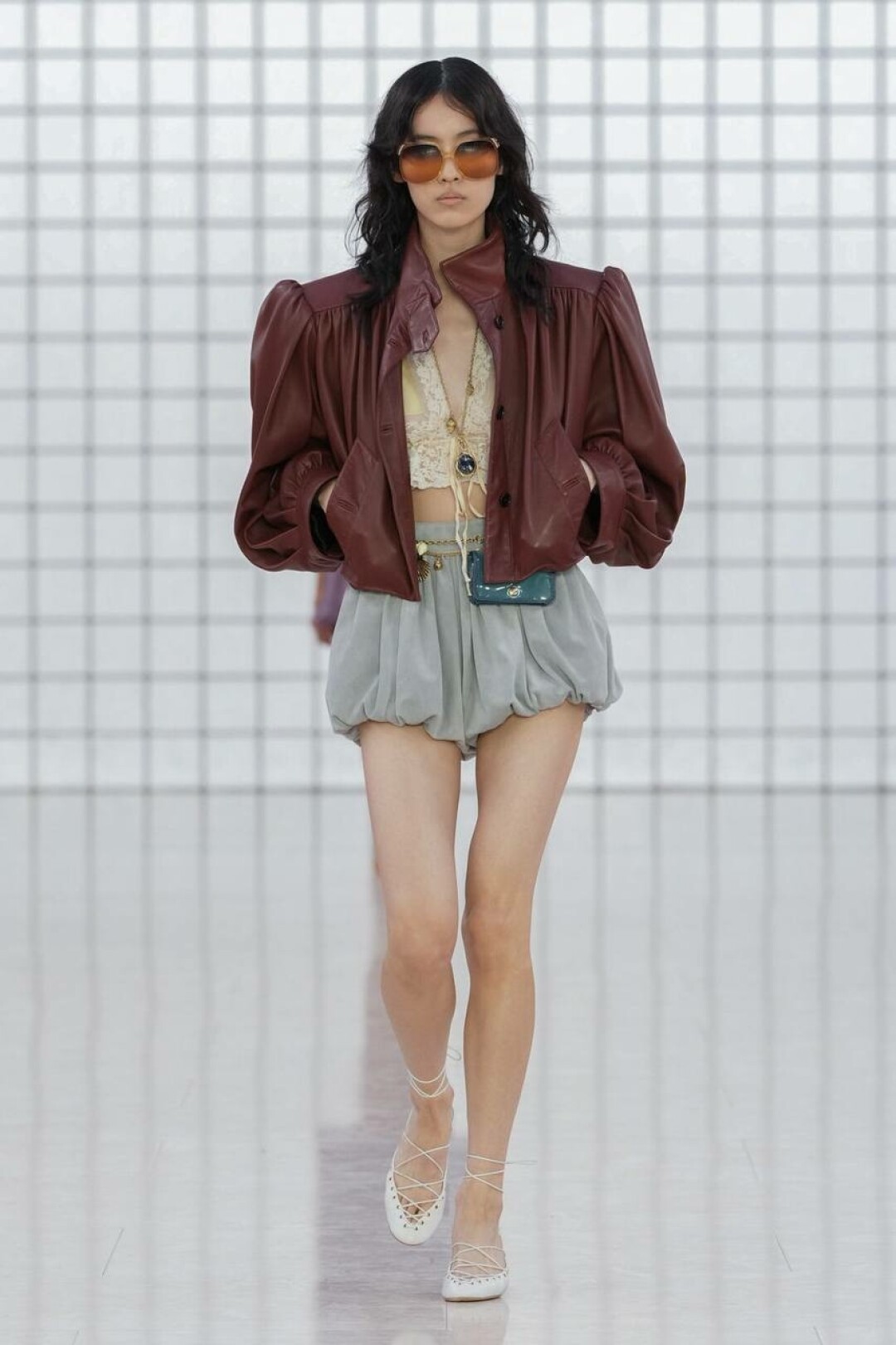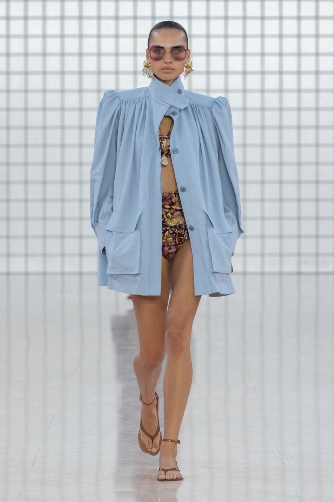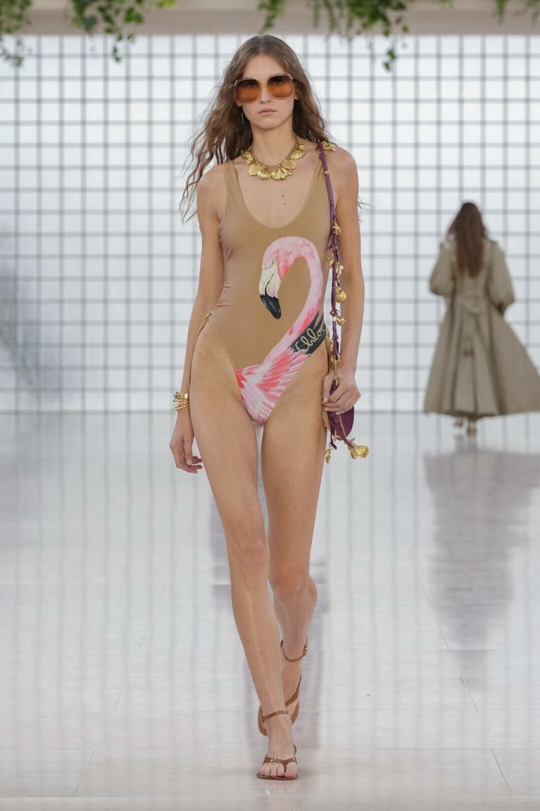 It-кейпы из осенне-зимней коллекции трансформировались в велюровые и кожаные бомберы с объемными рукавами-буфами, феминные ворквир-куртки (носим поверх флористических ретро-купальников) и расклешенные плащи. Понимая непредсказуемость летнего сценария (и всевозможные погодные твисты), вместе с верхней одеждой Камали сочинила воздушные платья в стиле ампир, снабдив их асимметричными юбками-баллонами, вязаные крючком боди-комбинезоны и купальники с фламинго.