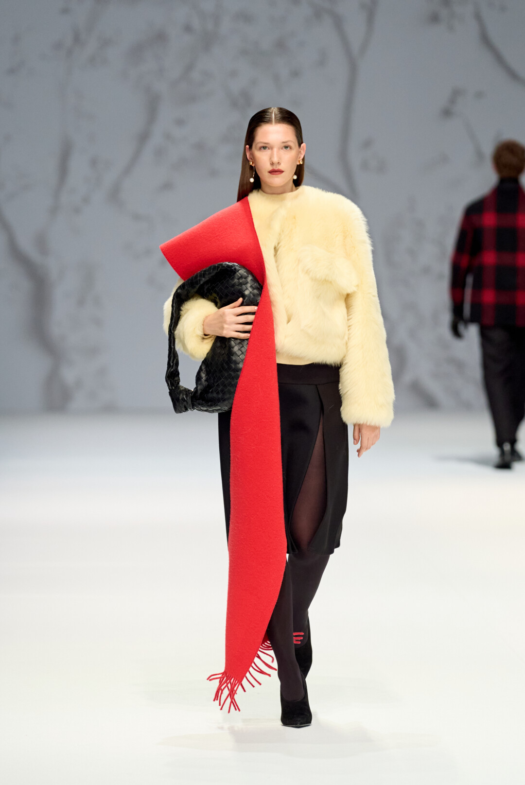 - сочетаем насыщенный алый с оттенком сливочного масла, например, пастельную шубу Bottega Veneta с ярким шарфом Jacquemus.