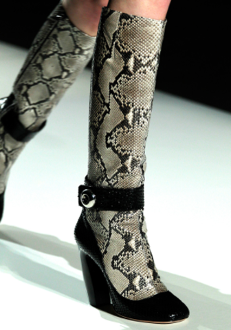 Высокие сапоги Prada из кожи питона становятся почти травоядными с застенчивой аппликацией в форме туфелек Мэри Джейн, украшенных на подъеме круглой пуговицей для пальто.