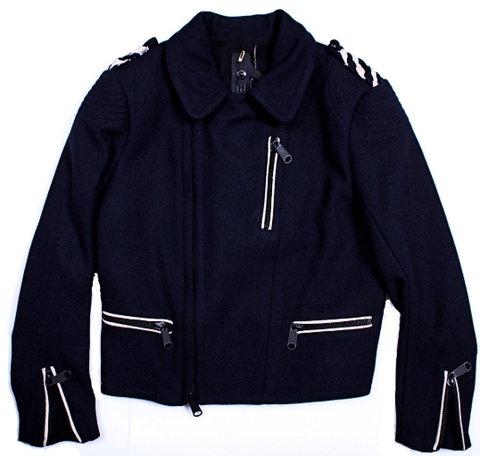 Мужская куртка Bernhard Willhelm скроена как рокерская косуха из классического темно-синего твида и украшена военными эполетами, элементы разных стилей сочетаются в одной этой вещи более чем гармонично.