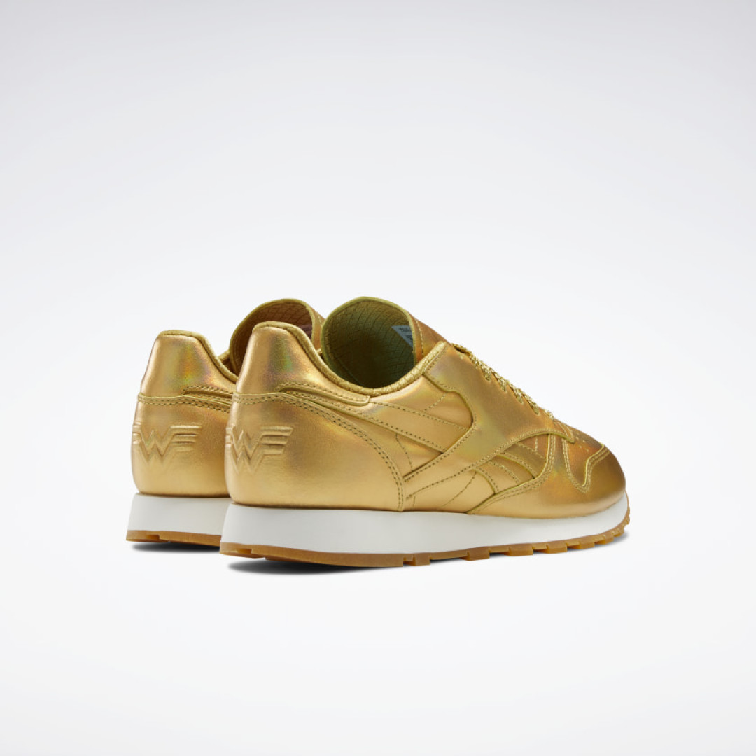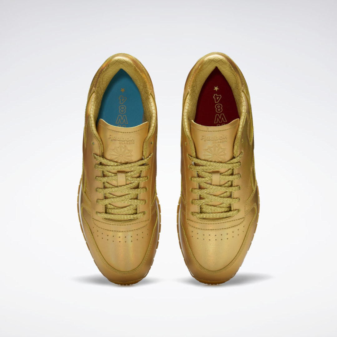 Среди них золотые легинсы, бра и кроссовки Classic Leather с олупрозрачной подошвой и шнурками с сияющим эффектом, отсылающие к новой блестящей броне Чудо-Женщины, спортивный костюм с полупрозрачными и светоотражающими вставками, вдохновленный полетом амазонки Дианы сквозь небо, и даже носки с символикой героини DC.