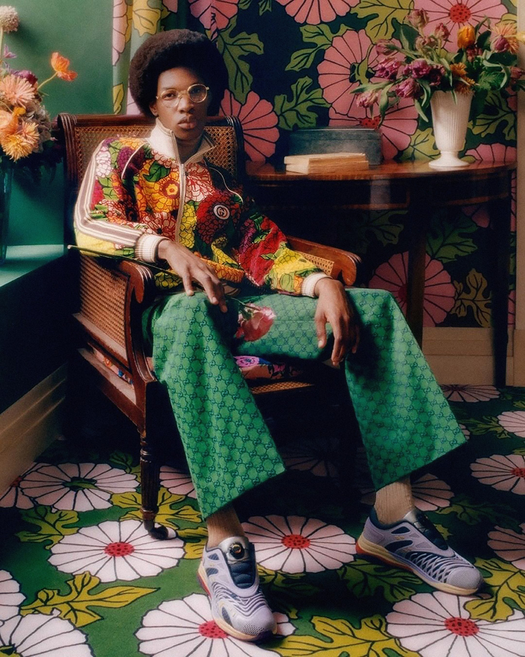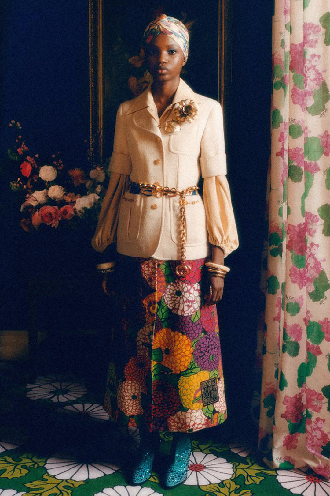 Алессандро Микеле уверенно освоил еще и профессию куратора: в капсульных коллекциях он открывает для нас новых художников. Например, теперь мы подписаны на Тревора Эндрю aka Gucci Ghost и Хелен Дауни aka Unskilled Worker. В этом сезоне дизайнер обратился не к актуальным именам, а к архивам — он знакомит нас с незаслуженно забытой звездой эпохи Пегги Гуггенхайм — американцем Кеном Скоттом. Пегги была его покровительницей, пока Кен не уехал в Милан, приняв решение пожертвовать карьерой живописца ради моды. Его поп-артовые цветочные рисунки, ставшие знаковыми принтами 1970-х, и цитирует дом Gucci, покрывая ими платья, шелковые рубашки, костюмы и панамы.
