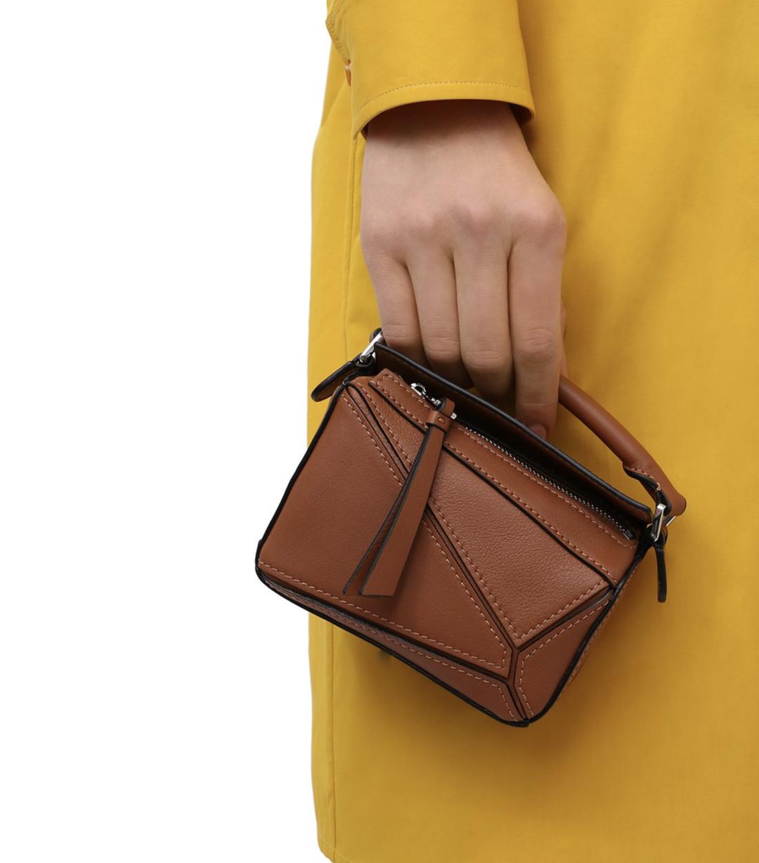 У супрематической сумки Puzzle Loewe вышла миниатюрная версия. Головомку сезона собрали из плотной телячьей кожи оттенка молочного шоколада.