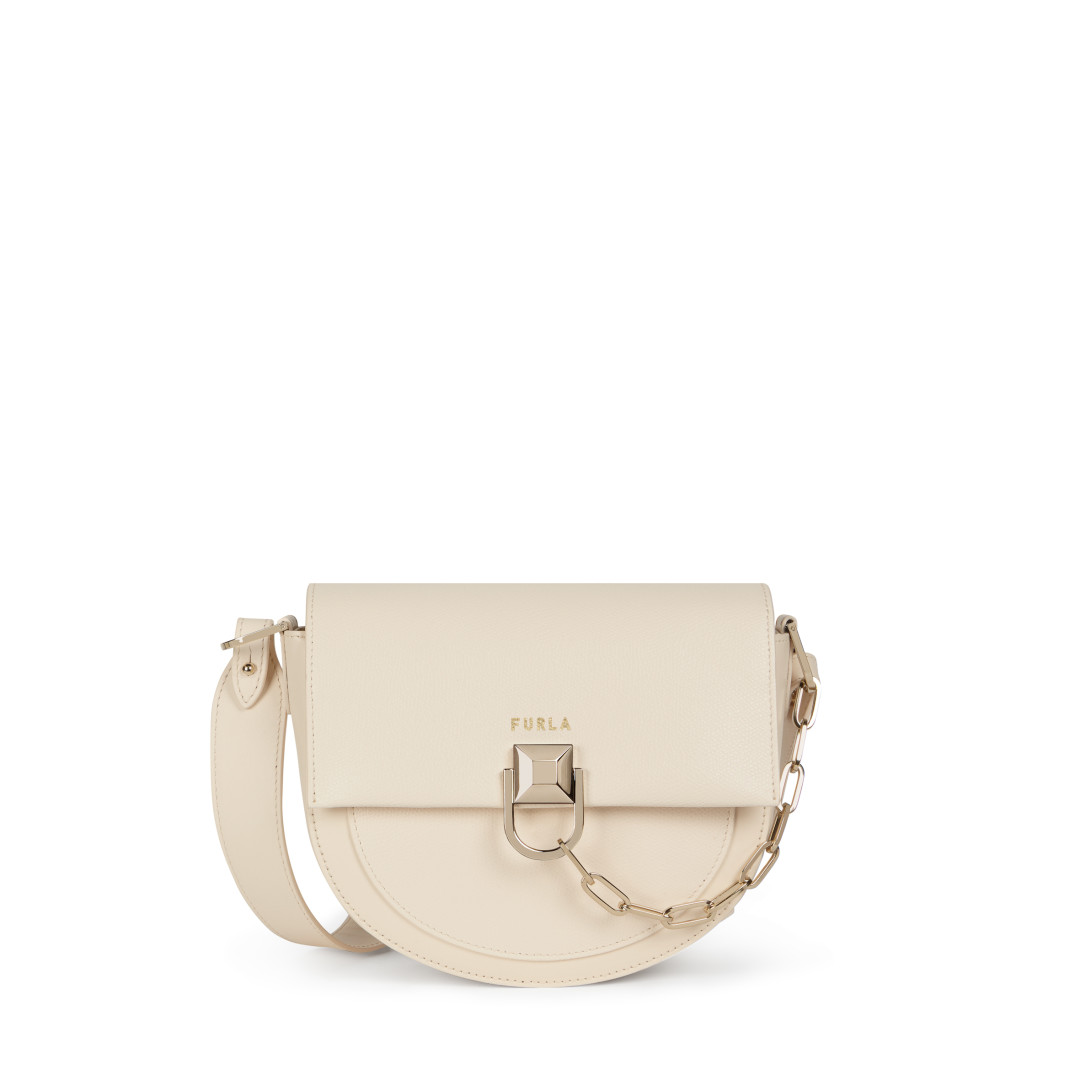 Сливочная кроссбоди Furla кажется милой только на первый взгляд: жесткая форма полумесяца и металлическая цепочка выдают непростой характер.