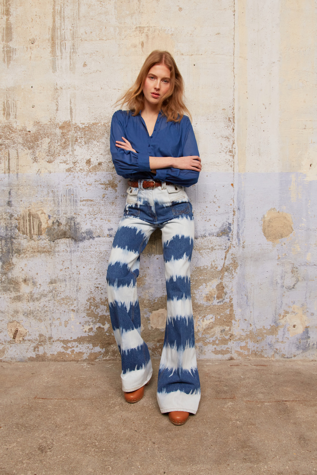Джинсы-клеш с геометричным эффектом tie-dye и рубашка из денима от Gerard Darel — лук-универсал. Надеемся, что летние фестивали будут, ведь нам это рок-н-ролльное сочетание напоминает о детях цветов и музыке.