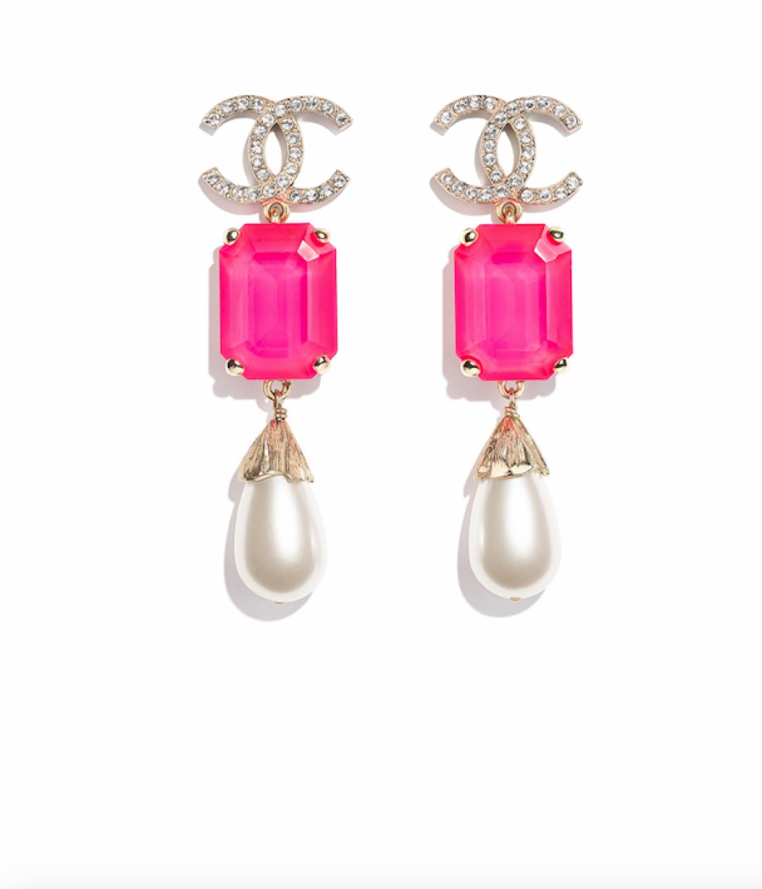 Серьги-леденцы Chanel с маджентовыми кристаллами и жемчужными каплями увенчаны заветным сияющим логотипом — теперь вы знаете, что выгуливать на вечеринки Международного экономического форума.