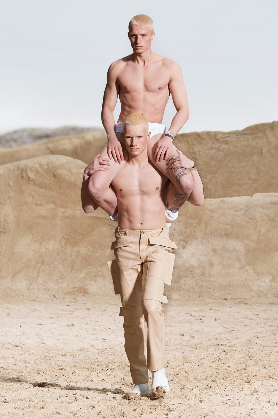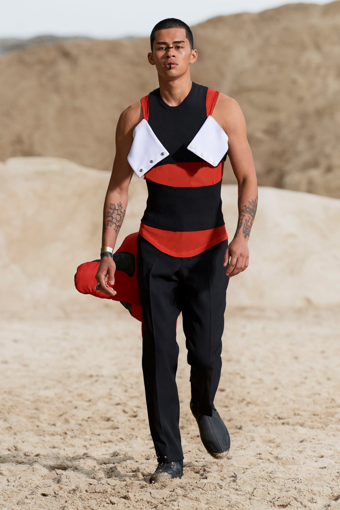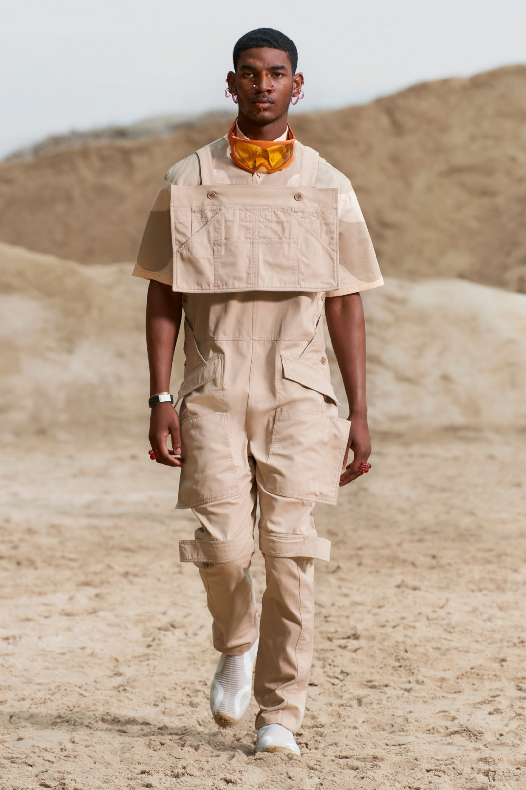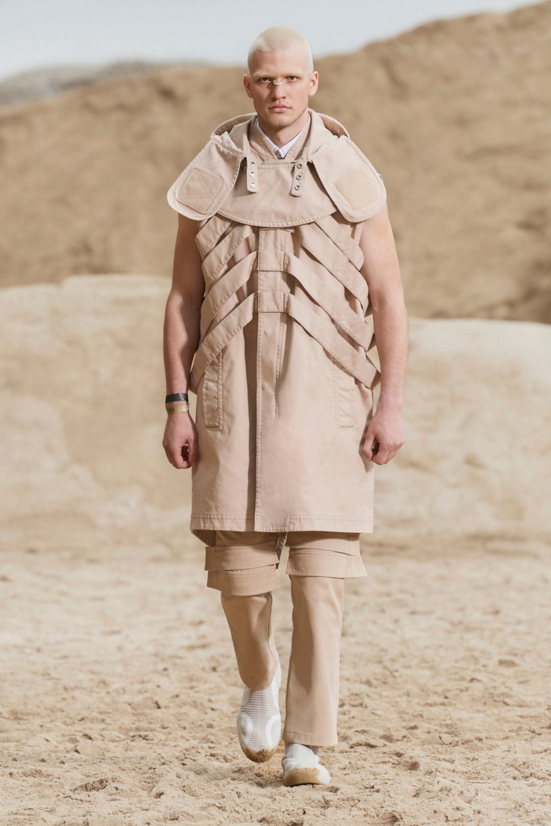 При создании коллекции Тиши использовал прием деконструкции, благодаря которому превратил классические тренчи Burberry в достаточно футуристичные: с выпирающими элементами, отстающими частями, без рукавов. Также креативный директор бренда поступил и с кожаными вещами, например, жилетами и брюками. Кроме них, в коллекцию вошли комбинезоны, топы из сетки, майки, брюки с карманами. Все — в песочных и черных цветах с добавлением красного и синего. Главным стилистическим приемом показа стал пирсинг. О том, как он вернулся на подиумы, мы рассказывали здесь.