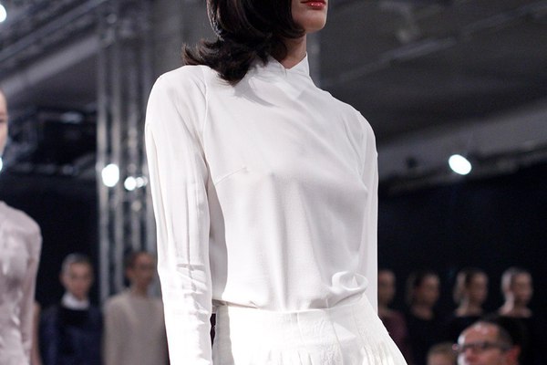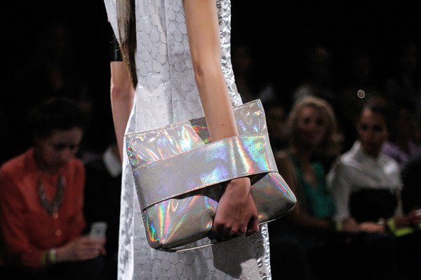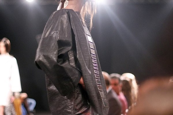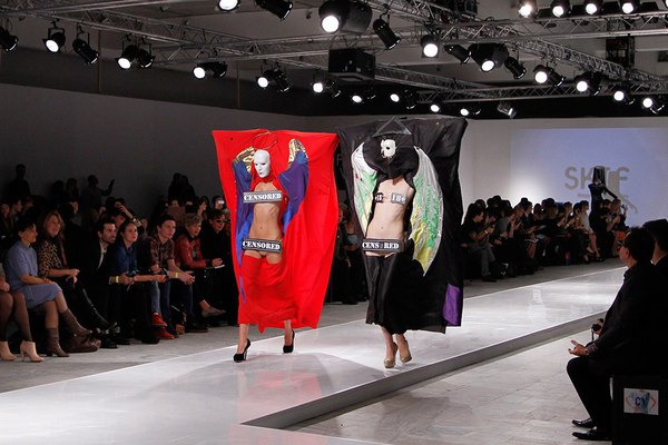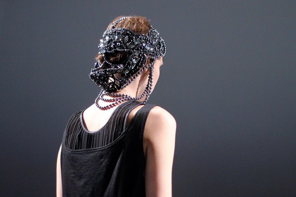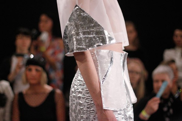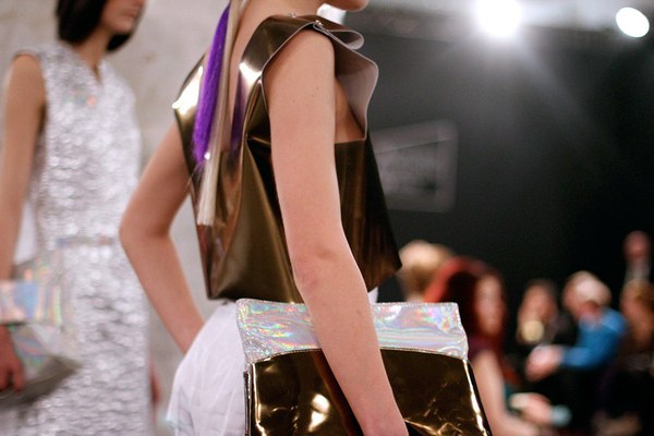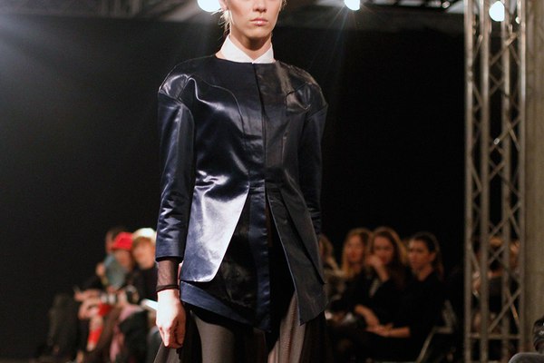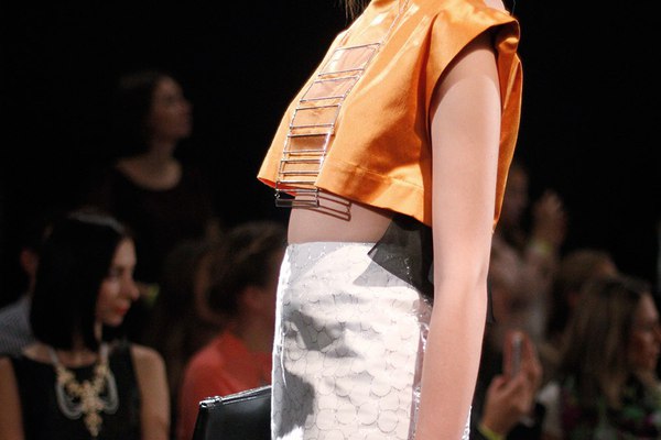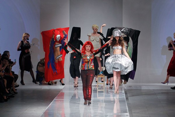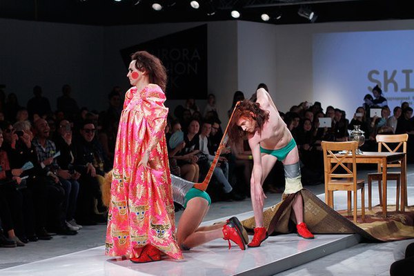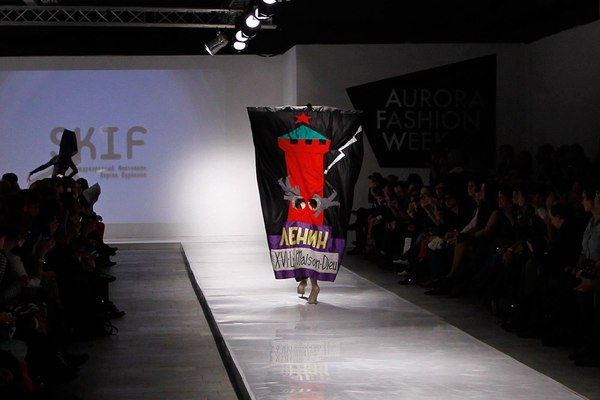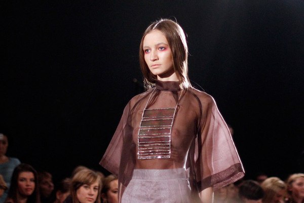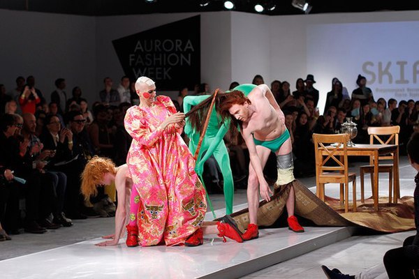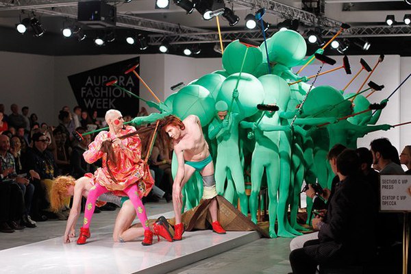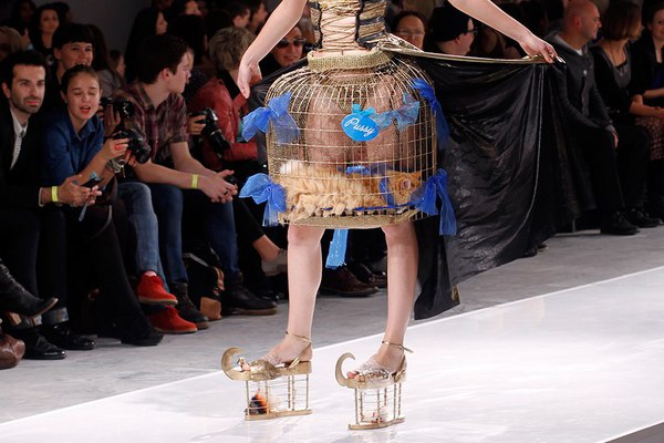 Первая часть шоу — показ Светы Петровой: вместо топа — аккордеоны на груди, вместо юбки — клетка с котом. Кстати, животное мы разглядели только на фотографиях. Может быть, в падении модели виноваты вовсе не туфли Алладина, а проснувшийся внезапно кот? Показ Андрея Бартенева — авангардный перфоманс, от которого городские фэшнистас закатывали глаза.