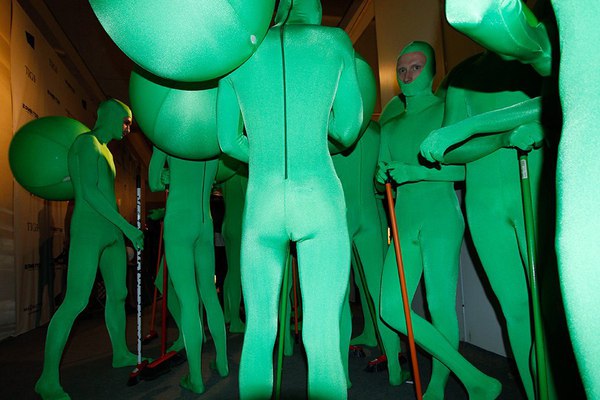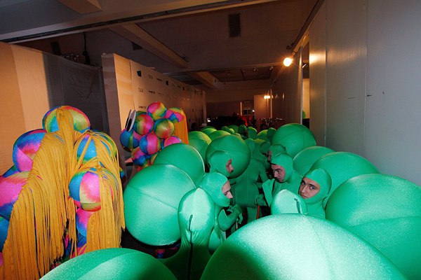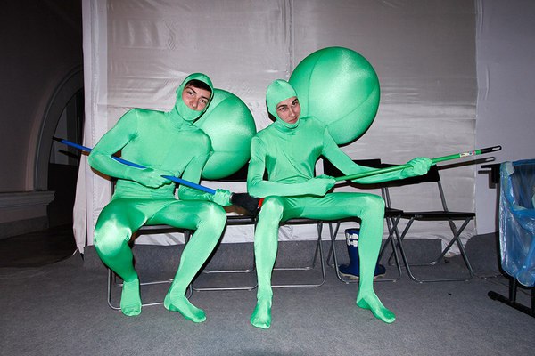 На входе бэкстэйджа нас встречают люди в зеленых костюмах с шарами на спине. У каждого по швабре. Представляются «бартеневскими человечками». Наш фотограф Саша Стокгольм пробирается через колонну и успевает сфотографировать Данилу Полякова и Бартенева.