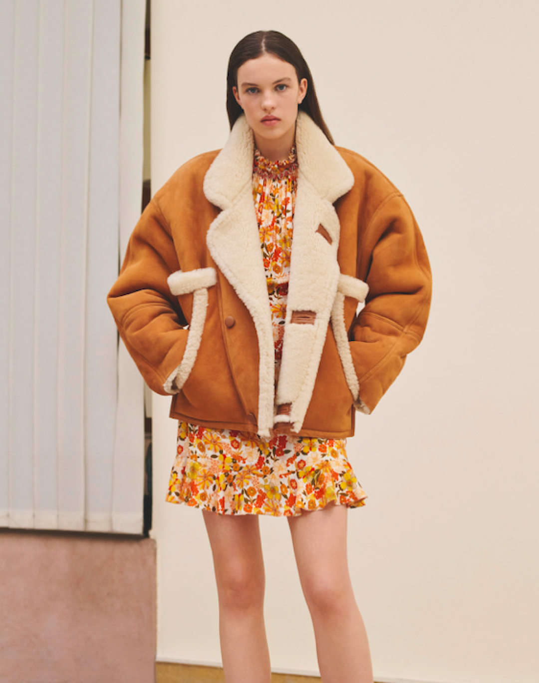 В Sandro умеют работать с пропорциями и текстурами — классическую дубленку объемного силуэта носим с легким мини-платьем.