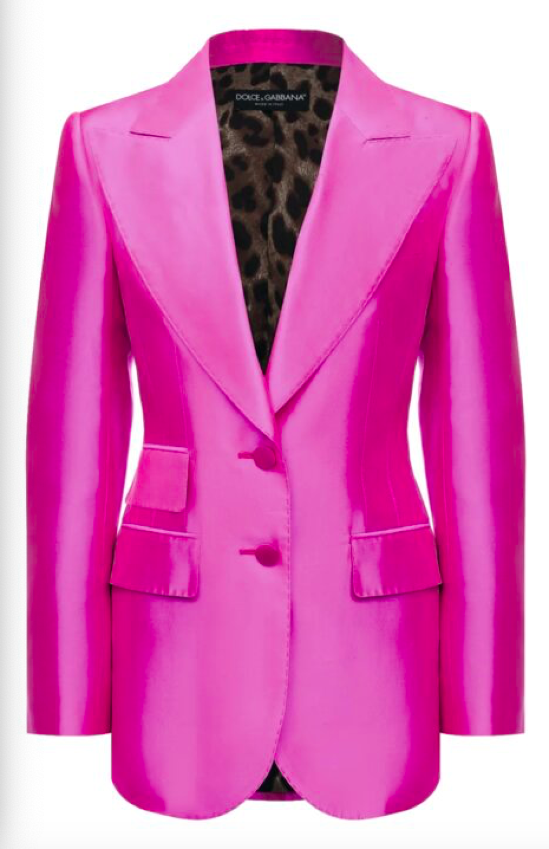 Приталенный атласный жакет Dolce & Gabbana попадает сразу в два тренда — супермодный цвет фуксии носим снаружи: а леопардовый принт — на подкладке.