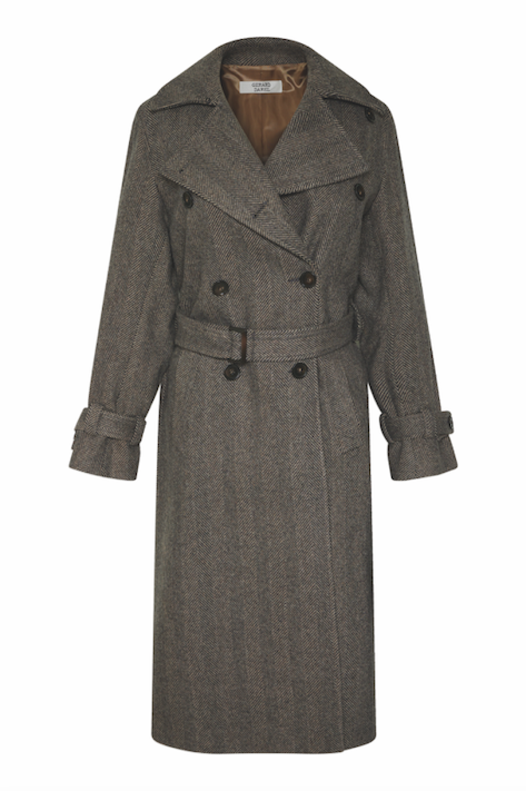 Двубортное пальто Gerard Darel с манжетами и поясом косплеит тренч — и это отличная альтернатива песочным вариантам. К тому же принт «в елочку» — снова хит!