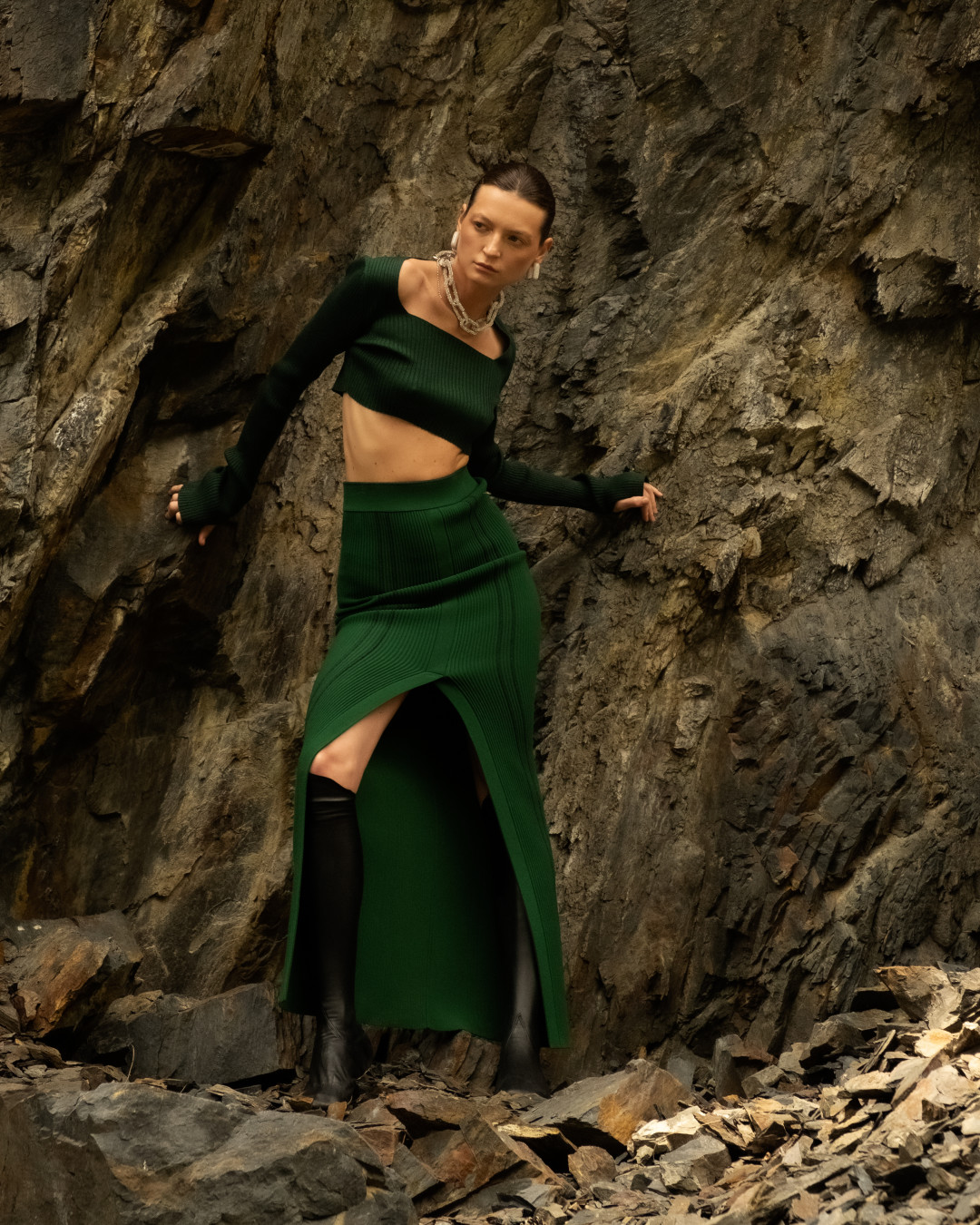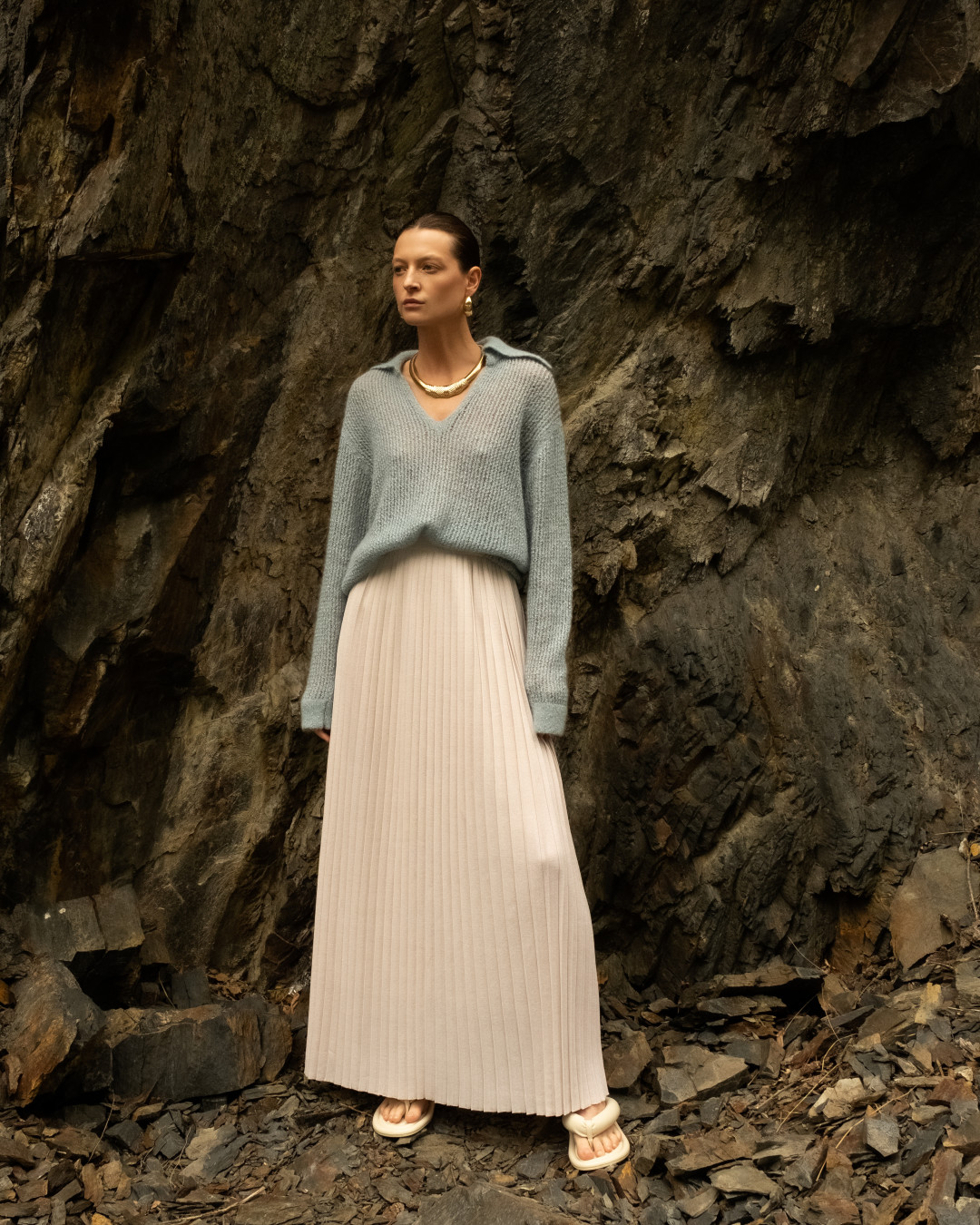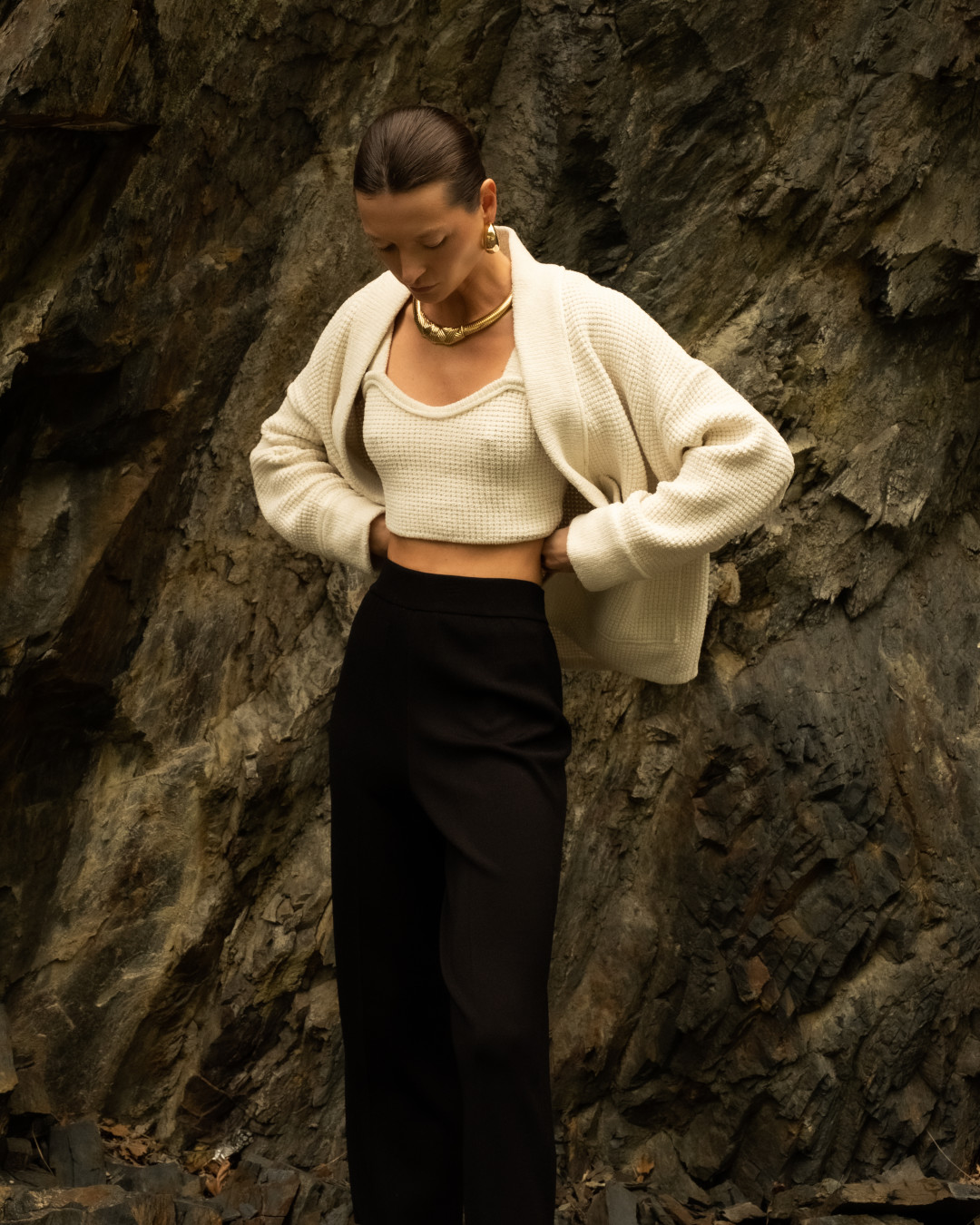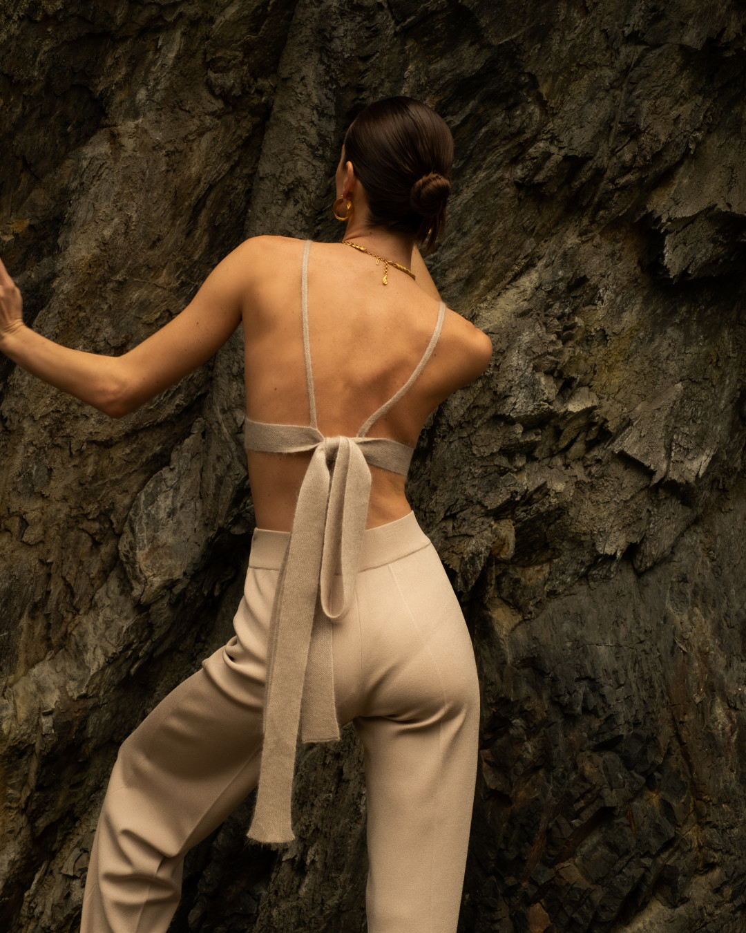 Производство марки находится в Петербурге и представляет собой экспериментальную творческую лабораторию. За высокие технологии отвечают японские вязальные машины Shima Seiki (они же в арсенале у премиального бренда Loro Piana), благодаря которым удалось создать новую пластику связанного полотна. Такая вязка делает вещи невесомыми, теплыми и тактильными, а также бережет ресурс работников производства. Кроме того, AND the brand не работают с готовыми тканями, даже в основе их бадлонов самостоятельно созданное плетение.