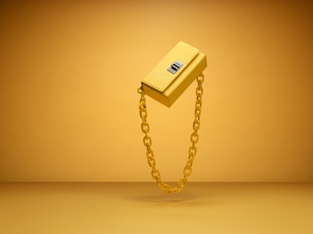 Плечевая цепочка, которая дополняет модель, также выполнена из переработанного материала — акрила. Сумка представлена в нескольких цветах: от ярких оранжевого и золотого до классических белого и черного.