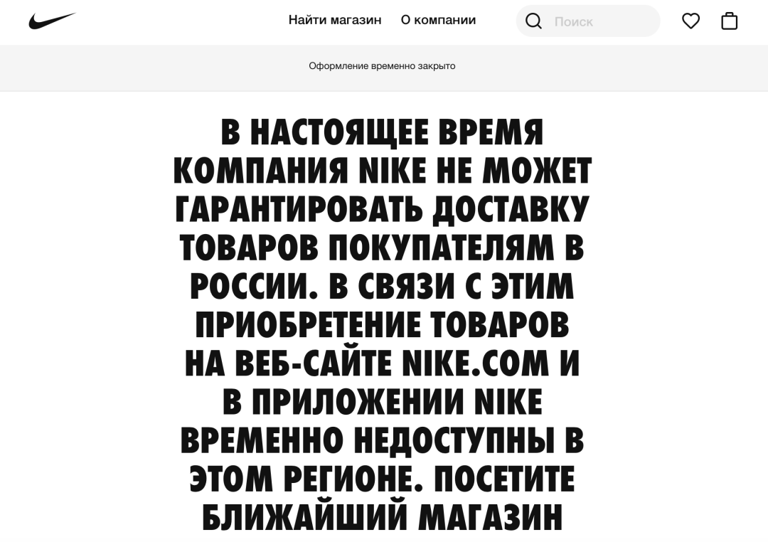 При оформлении заказа на сайте Supreme стало невозможно выбрать доставку в Россию. Информации (как и гарантий) получат ли россияне вещи, заказанные ранее, нет. На главной странице онлайн-магазина спортивного бренда Nike значится: «Преобретение товаров на веб-сайте nike.com и в приложении временно недоступны в этом регионе. Посетите ближайший магазин». Офлайн-магазины Nike пока работают в России, сообщений о закрытии торговых точек на данный момент не было.