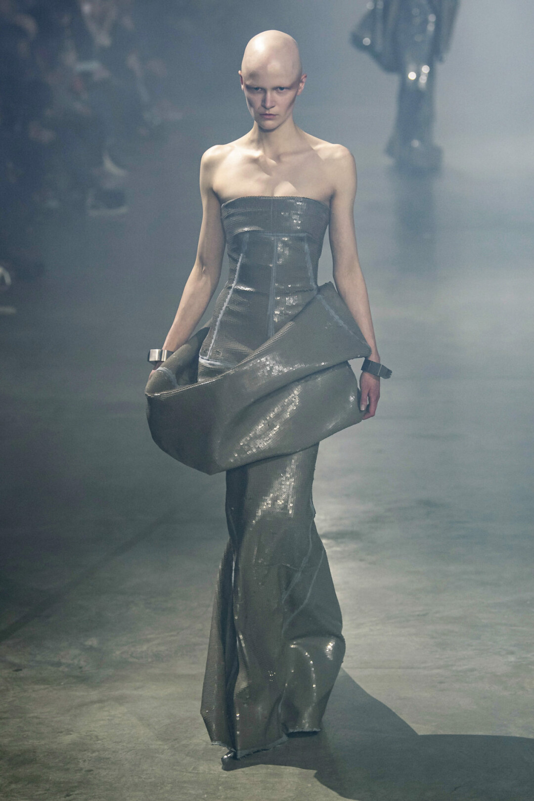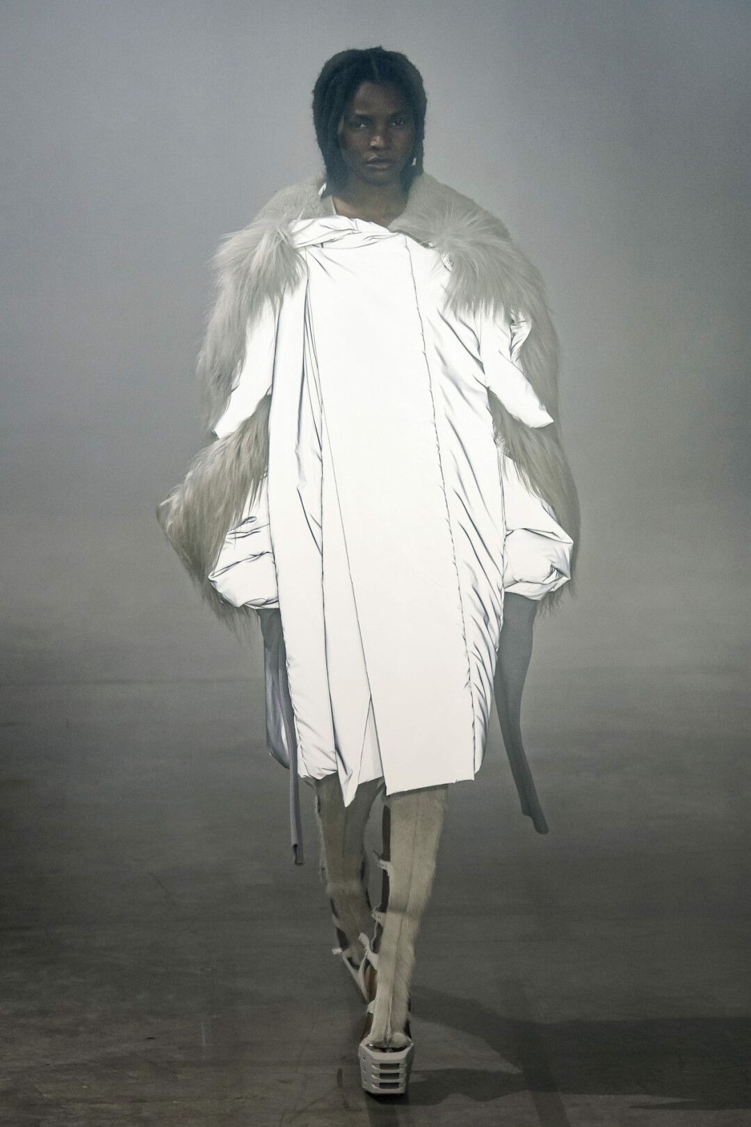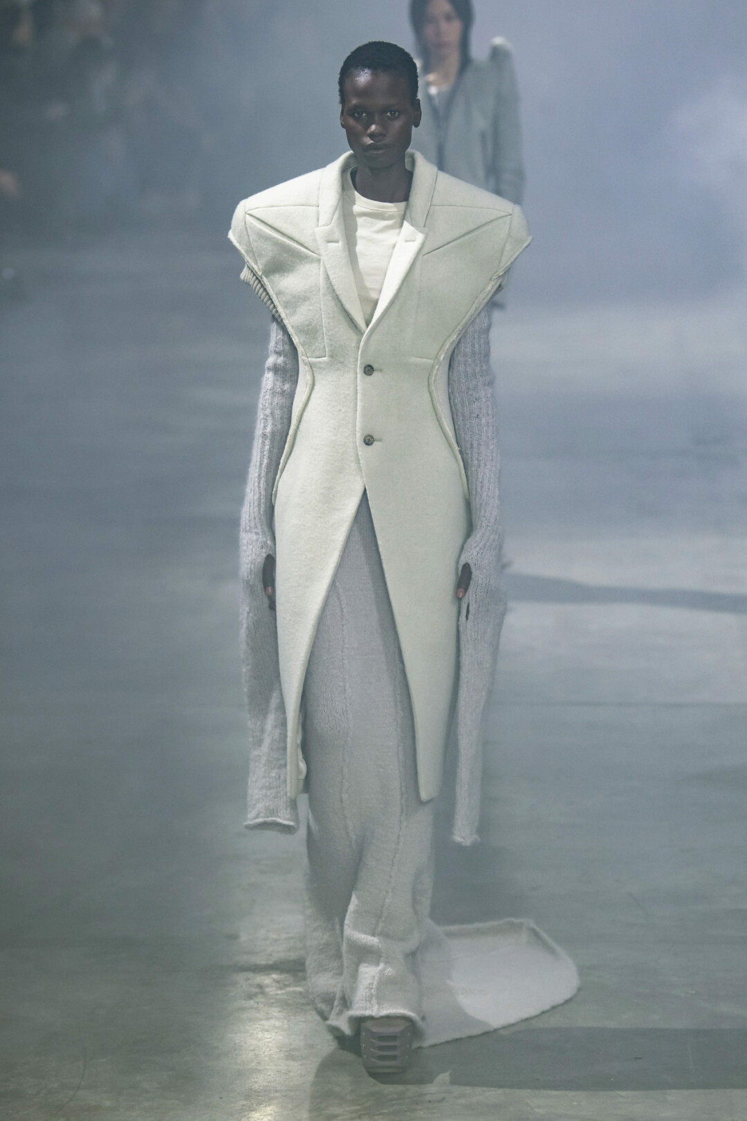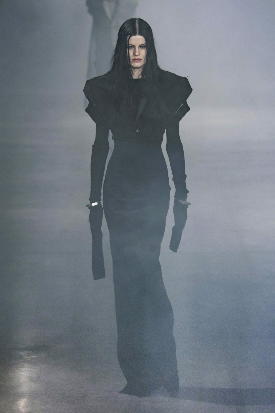 Новая коллекция Rick Owens состоит из знаковых для бренда объемных и сложных по форме пуховиков, накидок, юбок и платьев в пол, вещей с экстремально острыми плечами, блестящих вечерних платьев. Верхнюю одежду и лонгсливы дополнили очень длинные рукава, а отдельные образы — современные поножи (доспехи, которые защищают переднюю часть ноги).