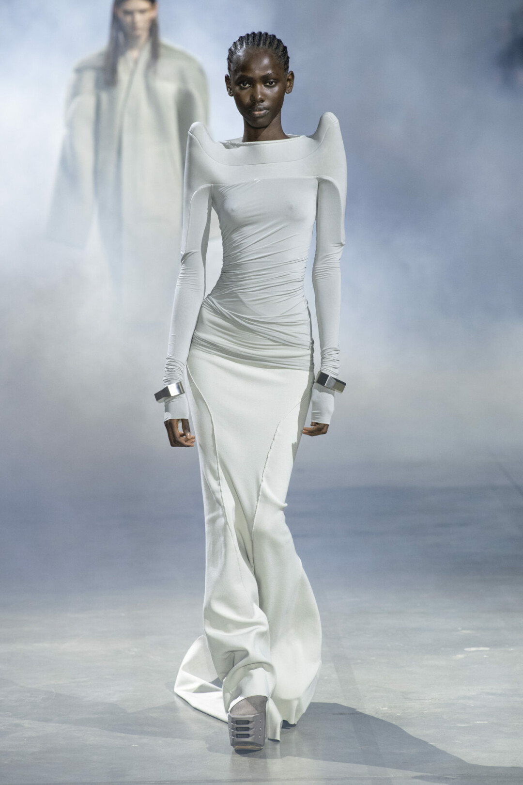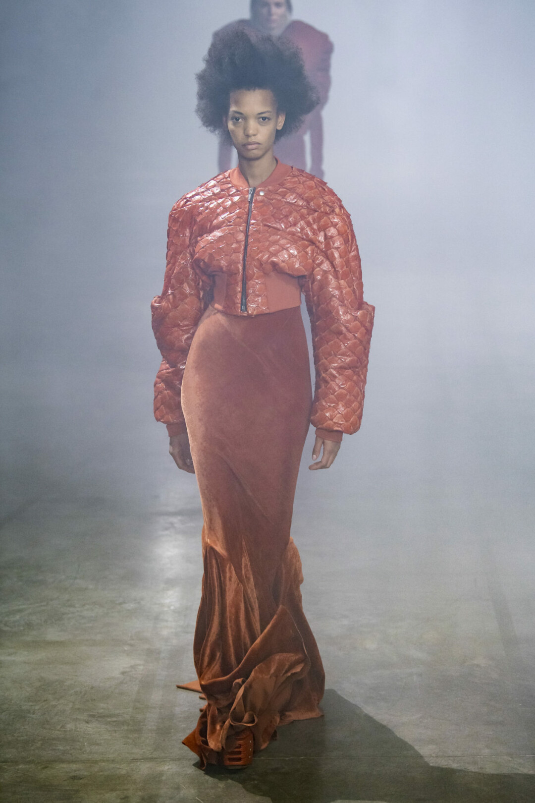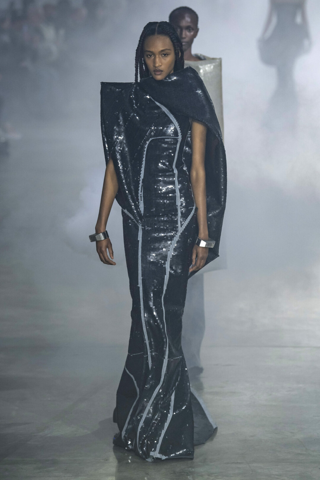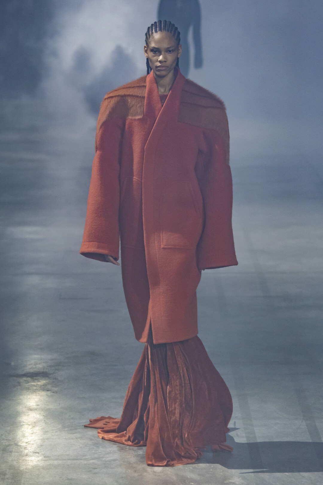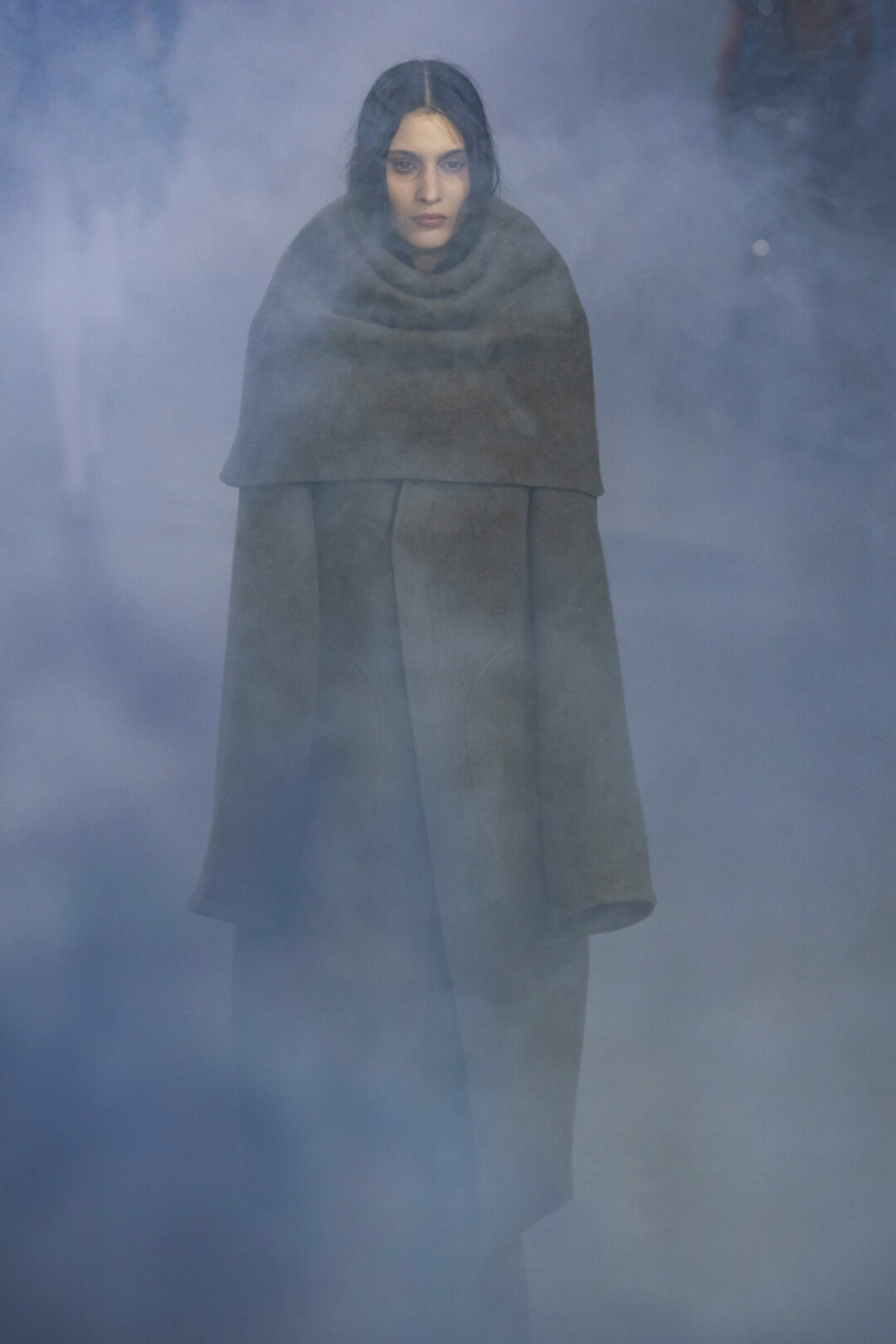 Новая коллекция Rick Owens состоит из знаковых для бренда объемных и сложных по форме пуховиков, накидок, юбок и платьев в пол, вещей с экстремально острыми плечами, блестящих вечерних платьев. Верхнюю одежду и лонгсливы дополнили очень длинные рукава, а отдельные образы — современные поножи (доспехи, которые защищают переднюю часть ноги).