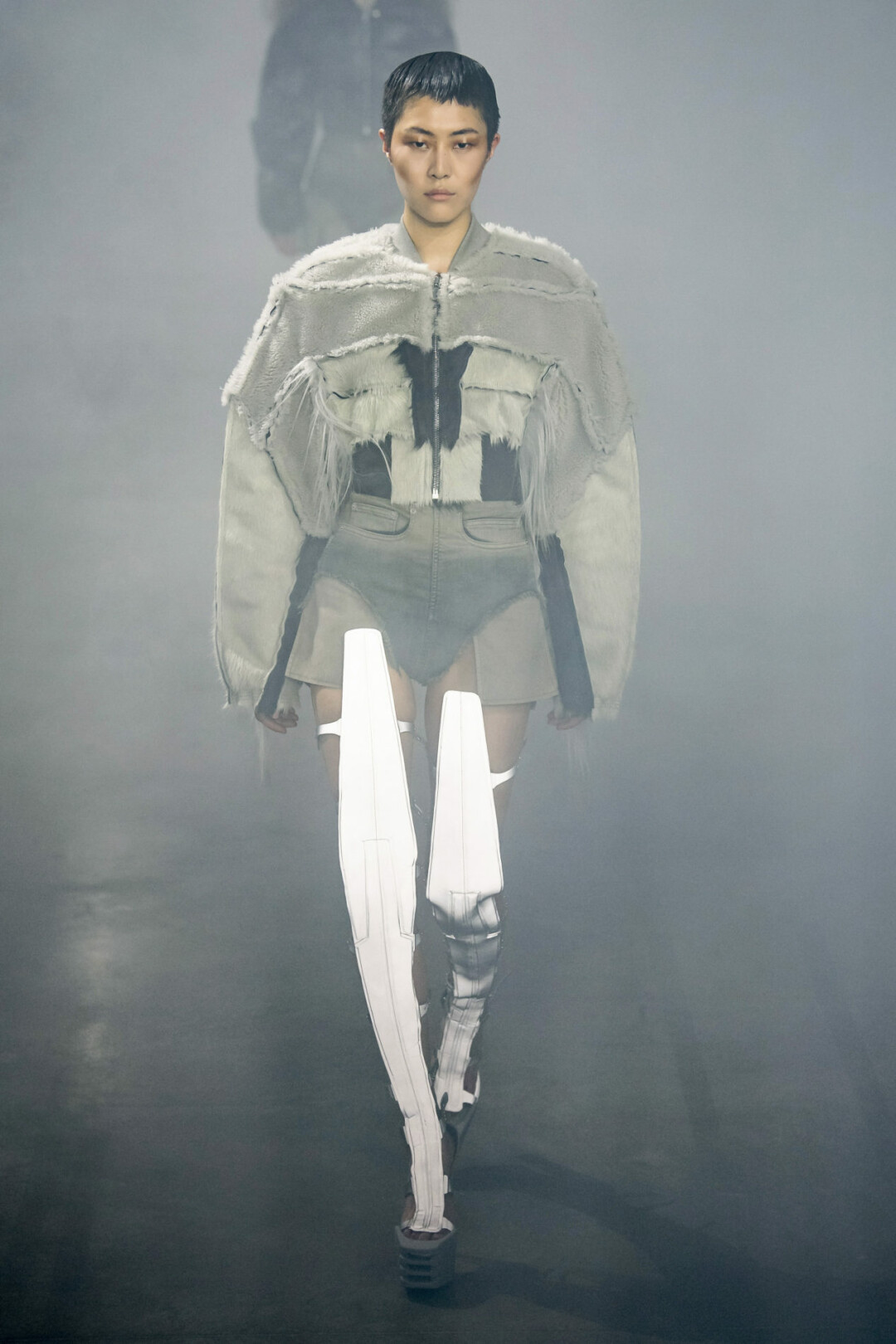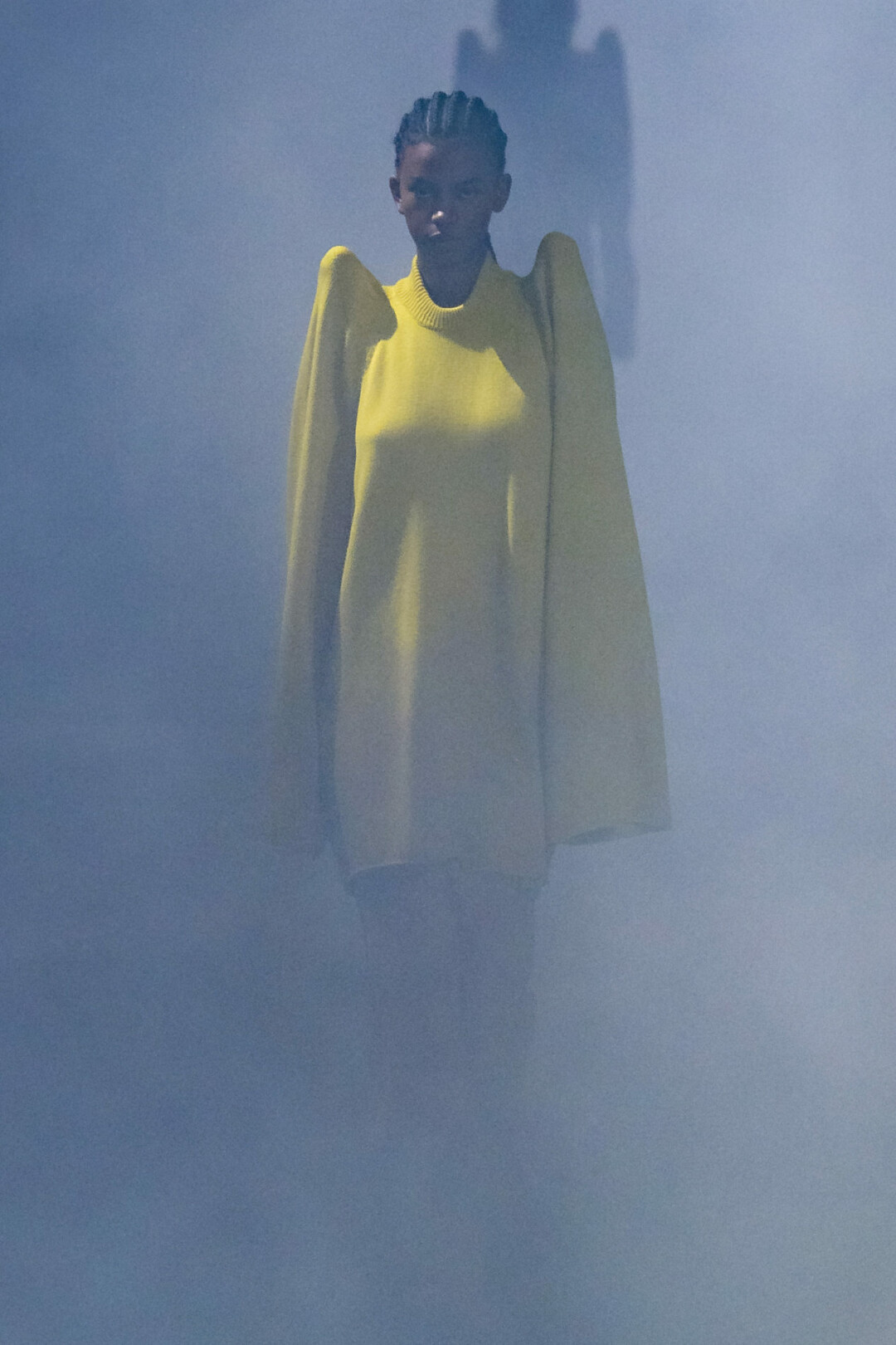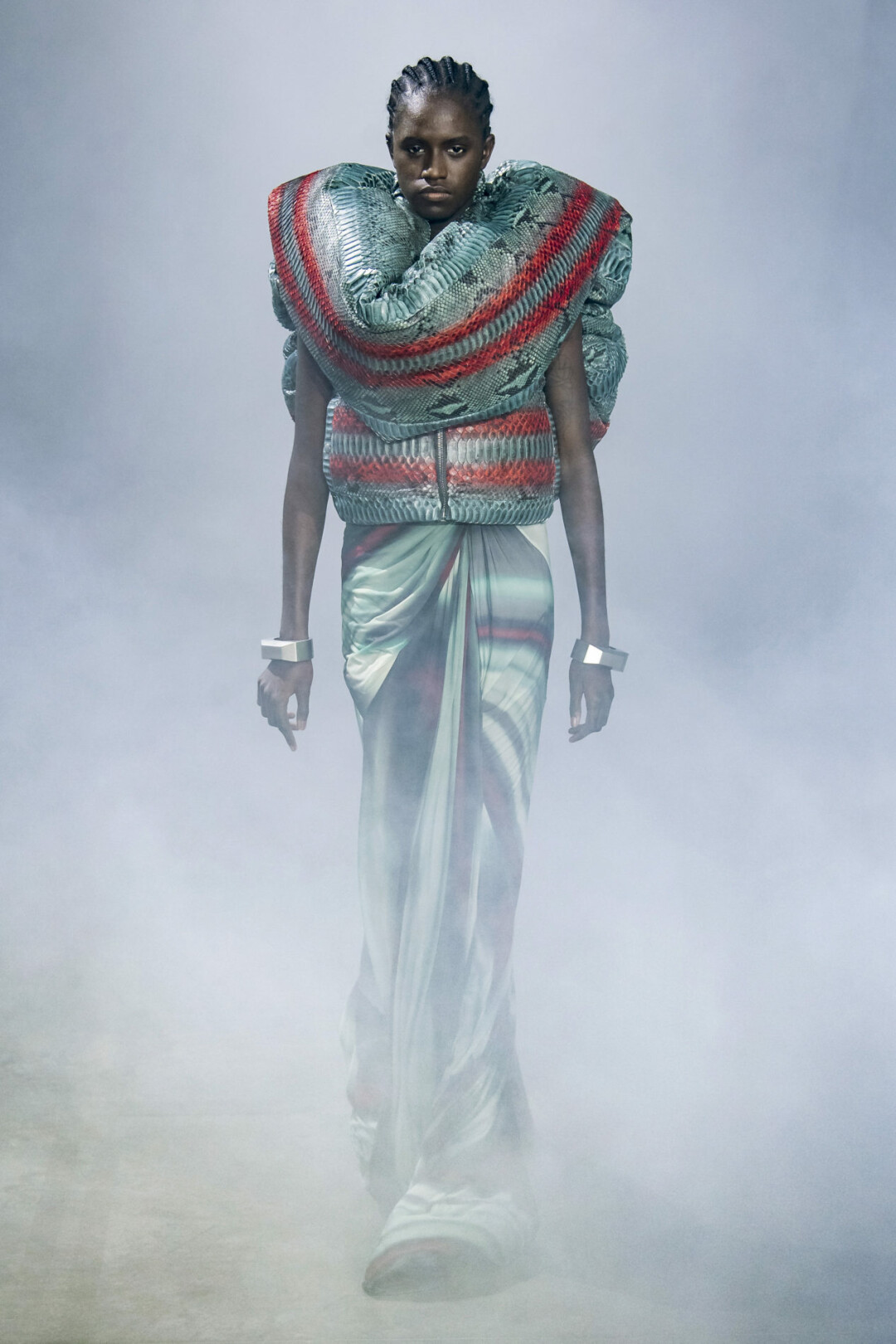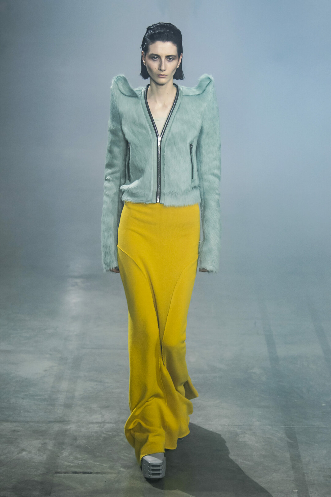 Новая коллекция Rick Owens состоит из знаковых для бренда объемных и сложных по форме пуховиков, накидок, юбок и платьев в пол, вещей с экстремально острыми плечами, блестящих вечерних платьев. Верхнюю одежду и лонгсливы дополнили очень длинные рукава, а отдельные образы — современные поножи (доспехи, которые защищают переднюю часть ноги).