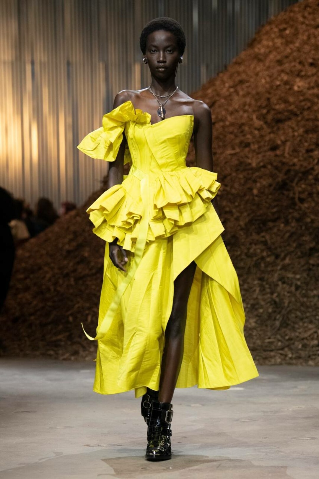 Большая часть коллекции создана из переработанных материалов. Кроме того, Alexander McQueen планируют в будущем использовать грибной мицелий для производства одежды. В этот раз Сара Бертон показала свитеры с принтами и вышивками в виде грибов, платья с воланами и оборками неоновых цветов, платья с открытыми плечами, костюмы как в черном варианте, так и в ярком, а также кожаные юбки и брюки.