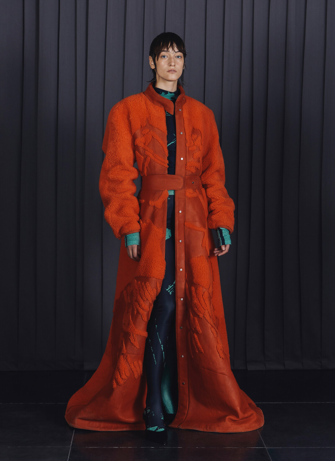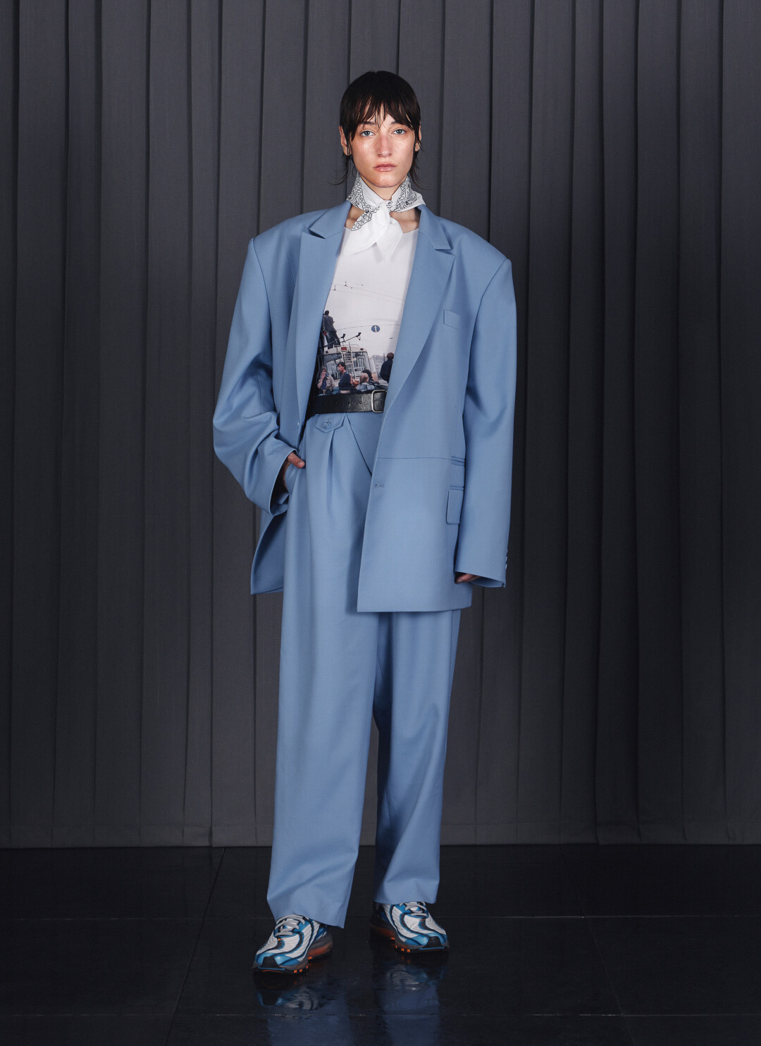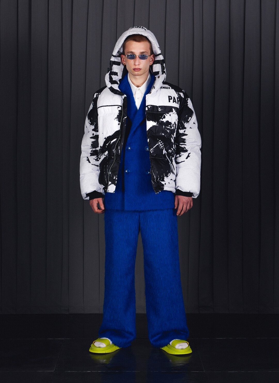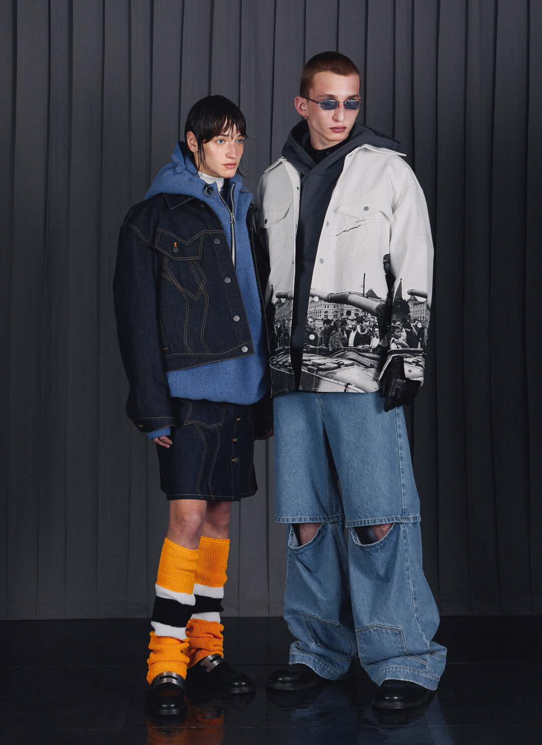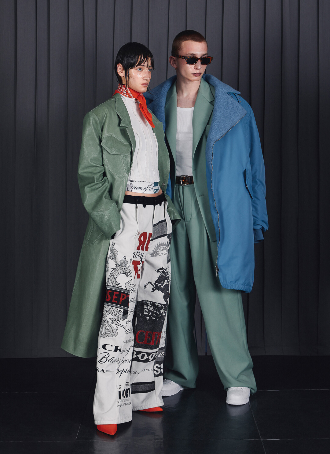 Киношные черные рокерские косухи в прочтении Red September — это куртки из тяжелой кожи в оттенке заводного апельсина, малиновые пиджаки теперь небесно-голубые и ультрамариновые, а свитер Данилы Багрова превратился в кардиган. Зато практически нетронутыми остались бандитские клетчатые пальто в пол. Еще один реверанс лентам Балабанова — кадры из фильмов в качестве рисунка на рубашках и платьях.