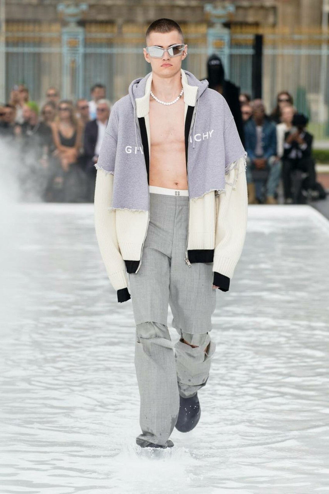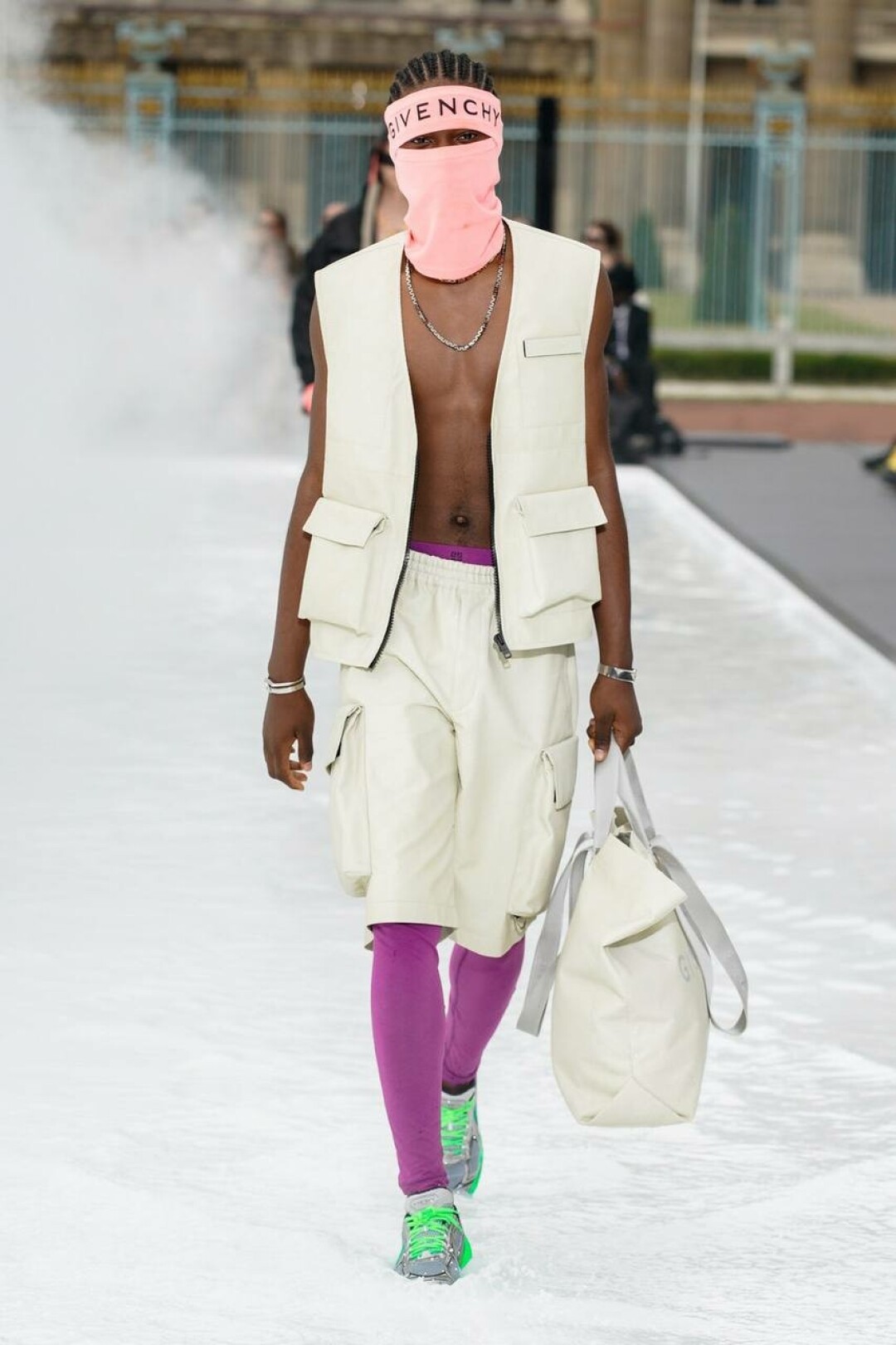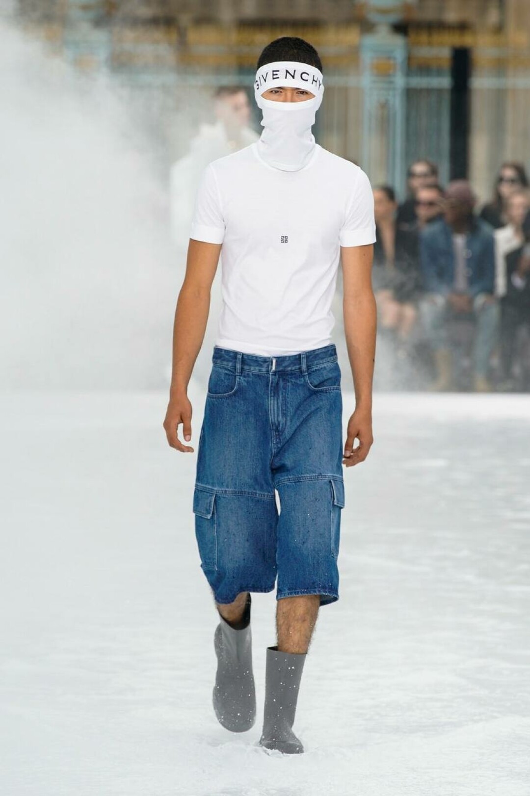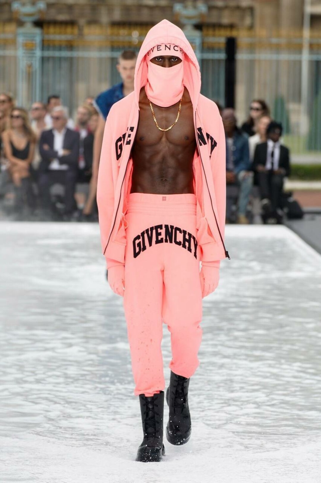 В Париже идет мужская Неделя моды, на которой новую коллекцию представил модный дом Givenchy. Показ бренда прошел в саду военного училища, а подиум был залит водой. По нему ходили модели в резиновых ботинках, балаклавах и спортивных костюмах неоновых цветов: салатового, розового, персикового. Большинство вещей и головные уборы украсил логотип Givenchy..